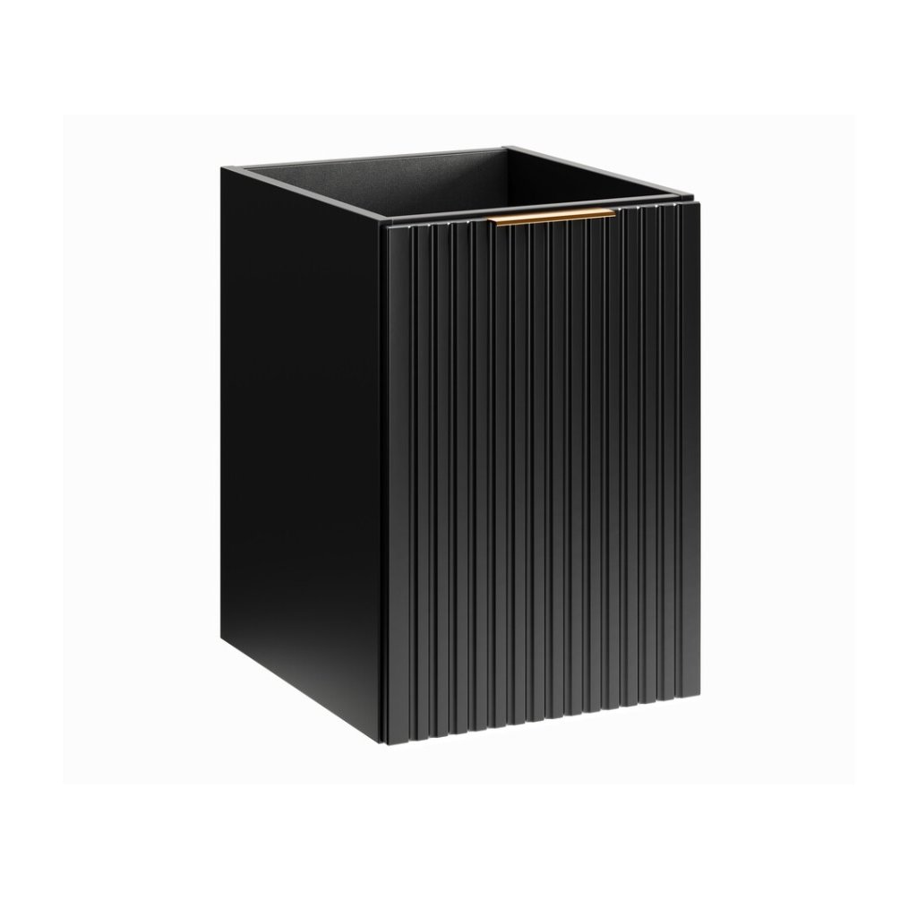 Setul perfect pentru baie Culoarea ADEL Black în culoarea neagră este ideală atât pentru băile moderne, cât și pentru cele clasice , iar funcționalitatea sa ridicată va asigura confort chiar și pentru cei mai exigenți utilizatori. Mobilierul pentru lavoar ADEL Black 81-40 are o ușă cu mecanism de închidere silențioasă cu coș. Designul minimalist este însuflețit de fronturile cu caneluri verticale , care sunt moderne și la mare căutare. Un alt avantaj este posibilitatea de a alege culoarea mânerelor, deoarece fiecare mobilier este livrat cu mânere în trei culori : auriu lucios, crom lucios și negru mat. Datorită acestui fapt, este posibilă coordonarea culorilor mânerelor cu accesoriile, oglinzile în diferite culori ale ramei sau reîmprospătarea aspectului mobilierului în viitor.