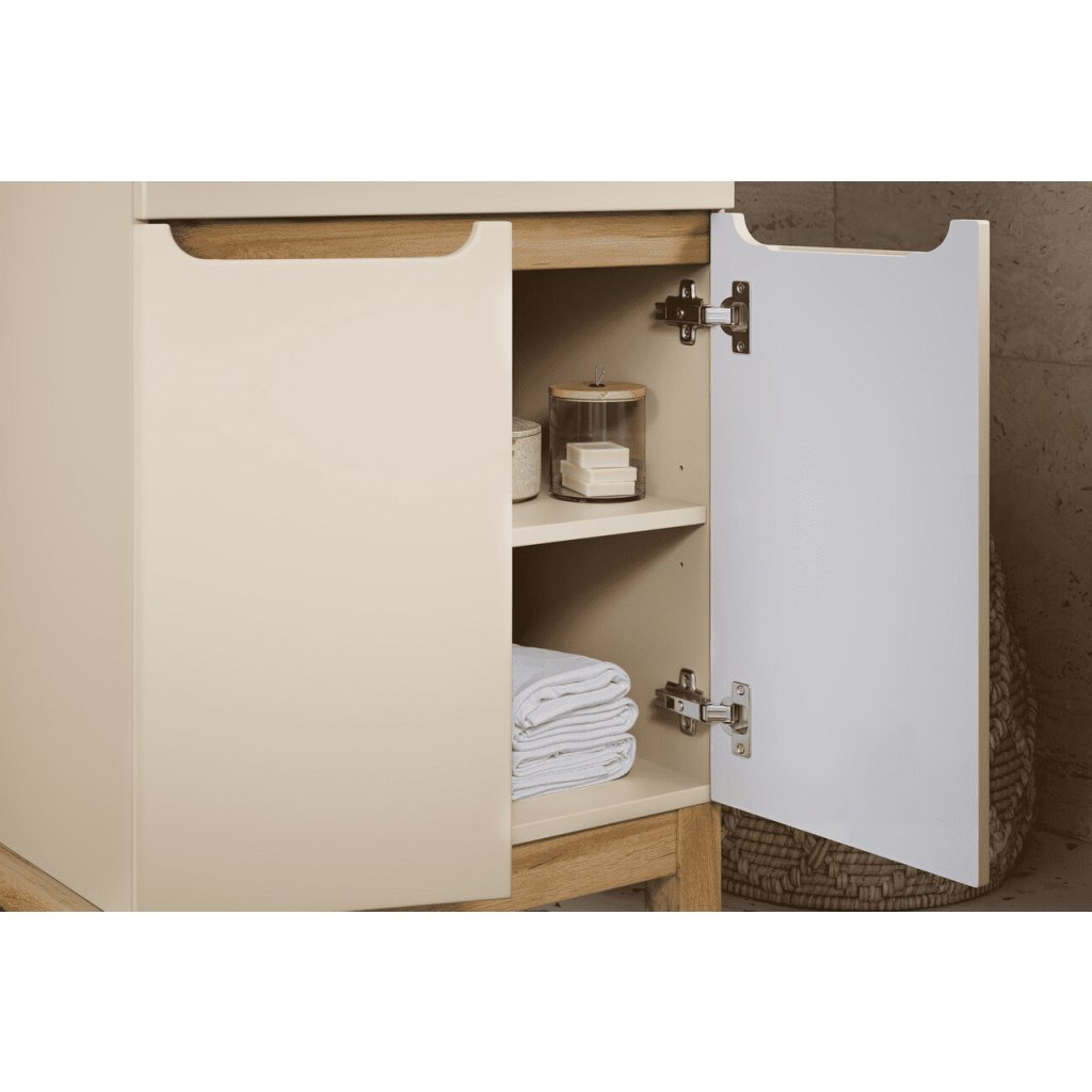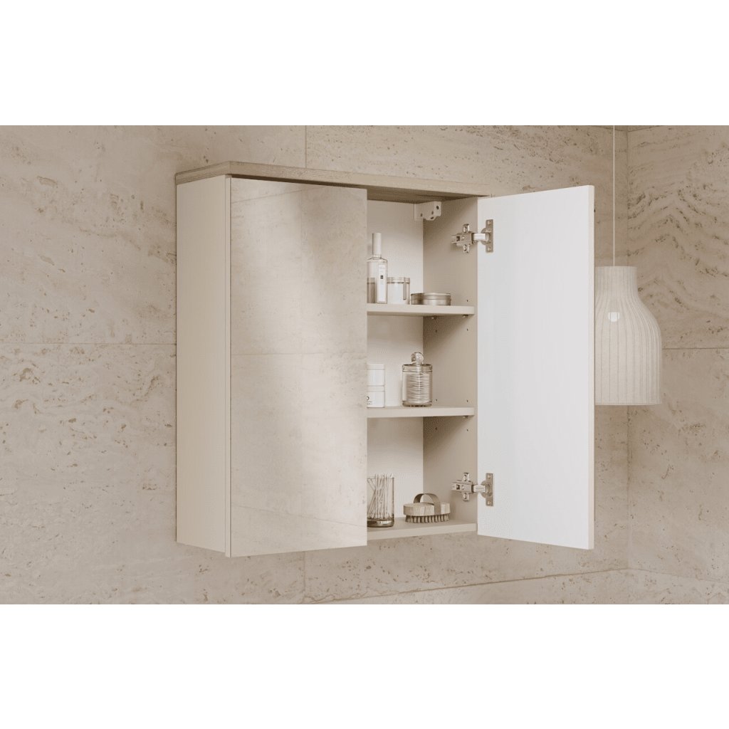 Transformă-ți baia într-un loc confortabil cu colecția BALI CASHMERE . Dulapurile cu oglindă BALI Cashmere 841 au două uși cu oglindă. Oferă mult spațiu de depozitare, de care ai nevoie întotdeauna. Designul modern de culori și materialele de înaltă calitate garantează o durată lungă de viață. Combinația dintre o nuanță moale de cașmir și lemnul natural arată modern, dar în același timp cald și confortabil.