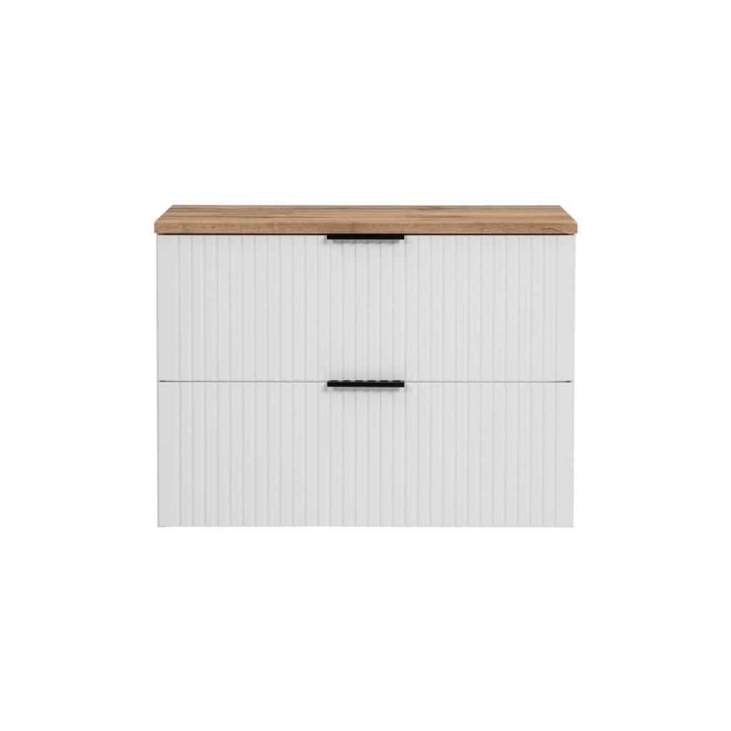 Mobilier de lavoar perfect cu blat ADEL D80/1 în alb combinat cu stejar Wotan Se potrivește perfect atât în băile moderne, cât și în cele clasice. Funcționalitatea sa ridicată va asigura confort chiar și pentru cei mai exigenți utilizatori. Designul minimalist este însuflețit de fronturile cu caneluri verticale, care sunt moderne și la mare căutare. Avantajul acestei colecții este posibilitatea de a alege culoarea mânerelor, prețul fiecărui dulap include trei versiuni de culoare ale mânerelor - auriu lucios, crom lucios și negru mat. Le puteți schimba în funcție de alte accesorii și totul se va potrivi perfect. Dulapul de sub chiuvetă este... se poate instala doar sifonul Preloc , celelalte nu sunt compatibile cu dulapul.