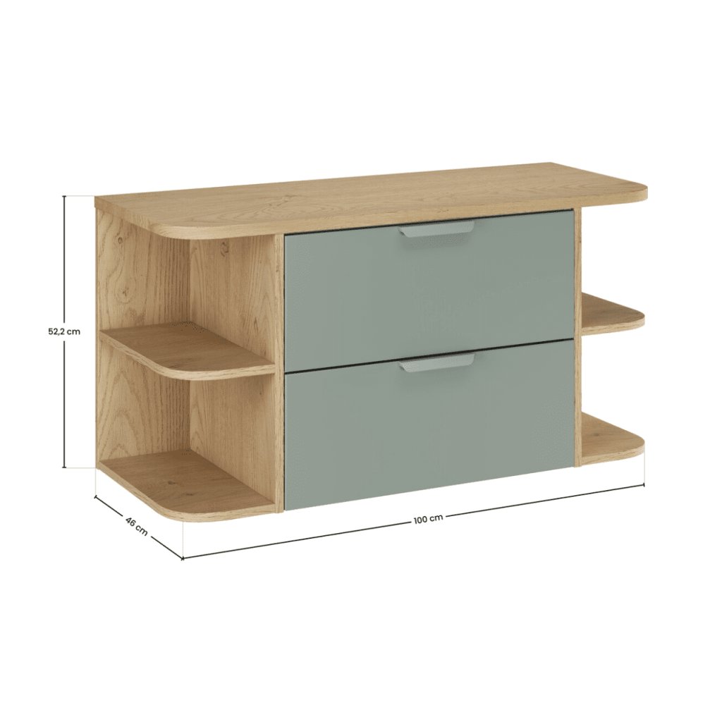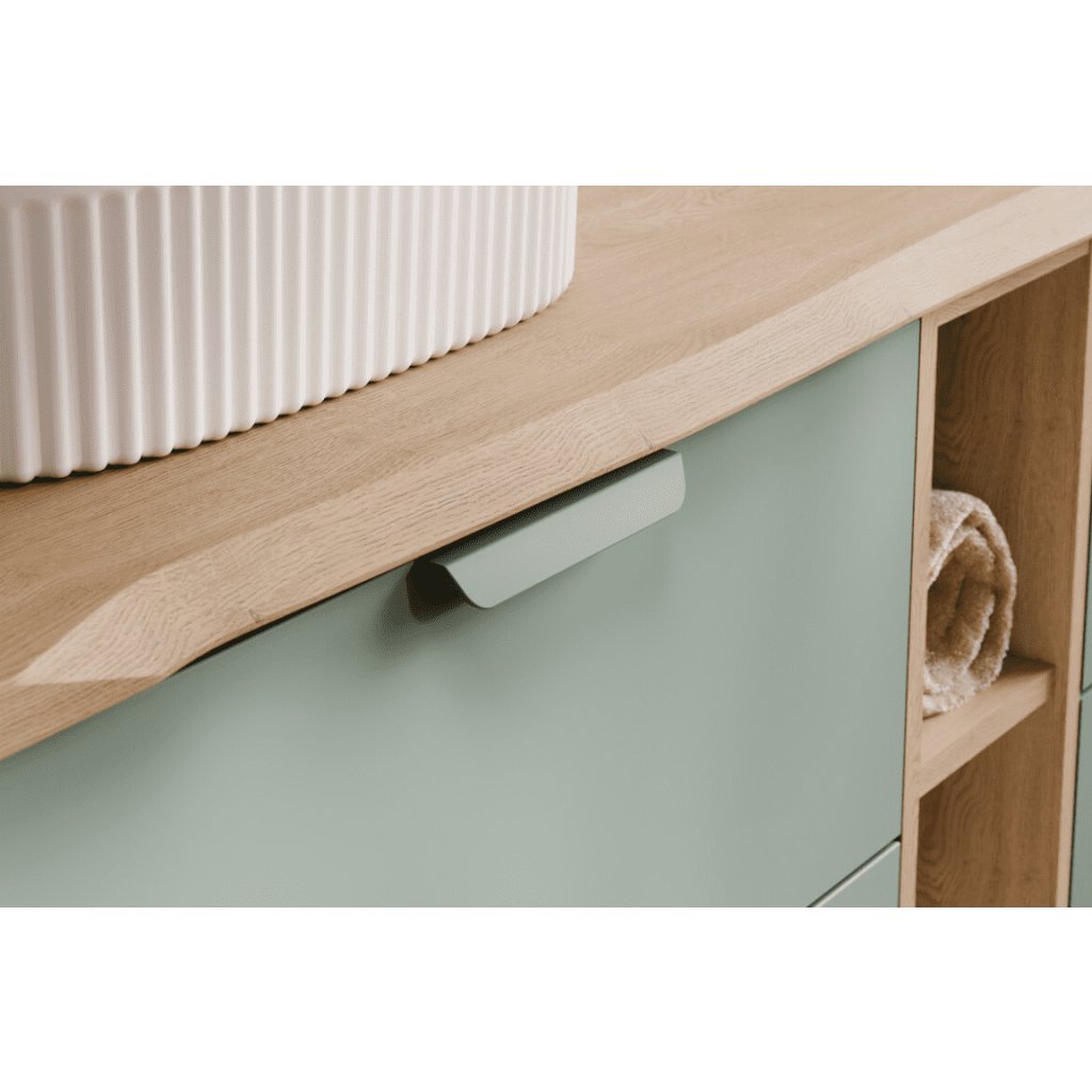 Creează o baie nu doar frumoasă, ci și perfect practică. Unitatea de baie ASTER Green de 100 cm , cu rafturi deschise pe laterale, oferă combinația ideală între spațiu de depozitare închis și rafturi deschise elegante. Două sertare spațioase din mijlocul dulapului oferă mult spațiu pentru cosmetice, produse de igienă și obiecte mici pe care dorești să le păstrezi depozitate ordonat. Rafturile deschise de pe laterale sunt ideale pentru prosoape, coșuri sau decorațiuni și conferă dulapului un aspect luminos și aerisit. Combinația dintre fronturile verzi ale sertarelor și decorul din lemn natural arată armonios și modern. Marginile rotunjite și mânerele minimaliste integrate subliniază designul atemporal al întregii serii ASTER Green .