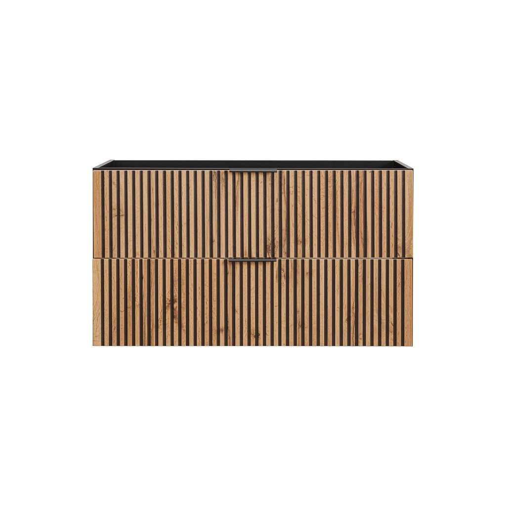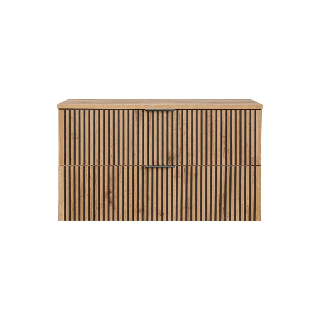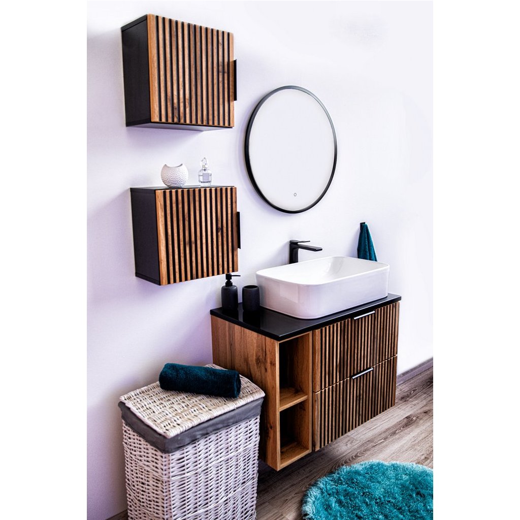 Mobilierul de baie modern cu blat XILO D100/1 în decor stejar Wotan nu este doar calitate și design modern, ci și confort și funcționalitate. Decorul distinctiv din lemn de stejar Wotan, în combinație cu canelurile negre, este o noutate pe piața mobilei, care este din ce în ce mai populară. Datorită materialelor de înaltă calitate și designului modern , vă va aduce bucurie pentru o lungă perioadă de timp.