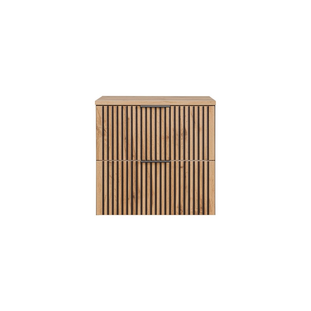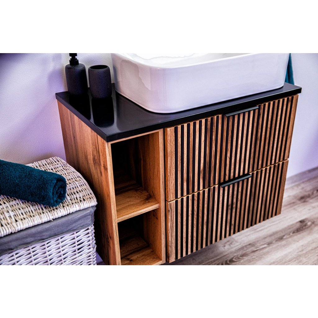 Mobilierul de baie modern XILO D60/1 cu decor din stejar Wotan nu este doar calitate și design modern, ci și confort și funcționalitate. Decorul distinctiv din lemn de stejar Wotan, în combinație cu canelurile negre, este o noutate pe piața mobilei, care este din ce în ce mai populară. Datorită materialelor de înaltă calitate și designului modern , vă va aduce bucurie pentru o lungă perioadă de timp.
