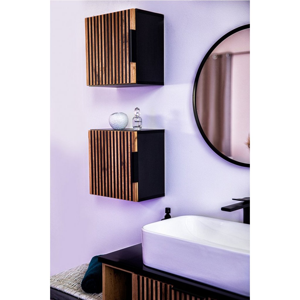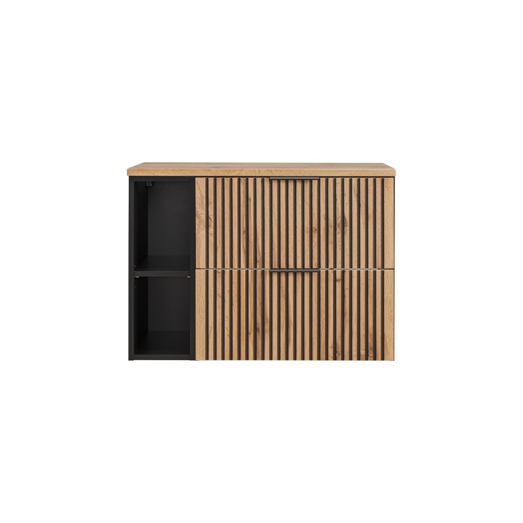 Mobilierul de baie modern cu blat XILO DU80/1 în decor stejar Wotan nu este doar calitate și design modern, ci și confort și funcționalitate. Decorul distinctiv din lemn de stejar Wotan, în combinație cu canelurile negre, este o noutate pe piața mobilei, care este din ce în ce mai populară. Datorită materialelor de înaltă calitate și designului modern , vă va aduce bucurie pentru o lungă perioadă de timp.