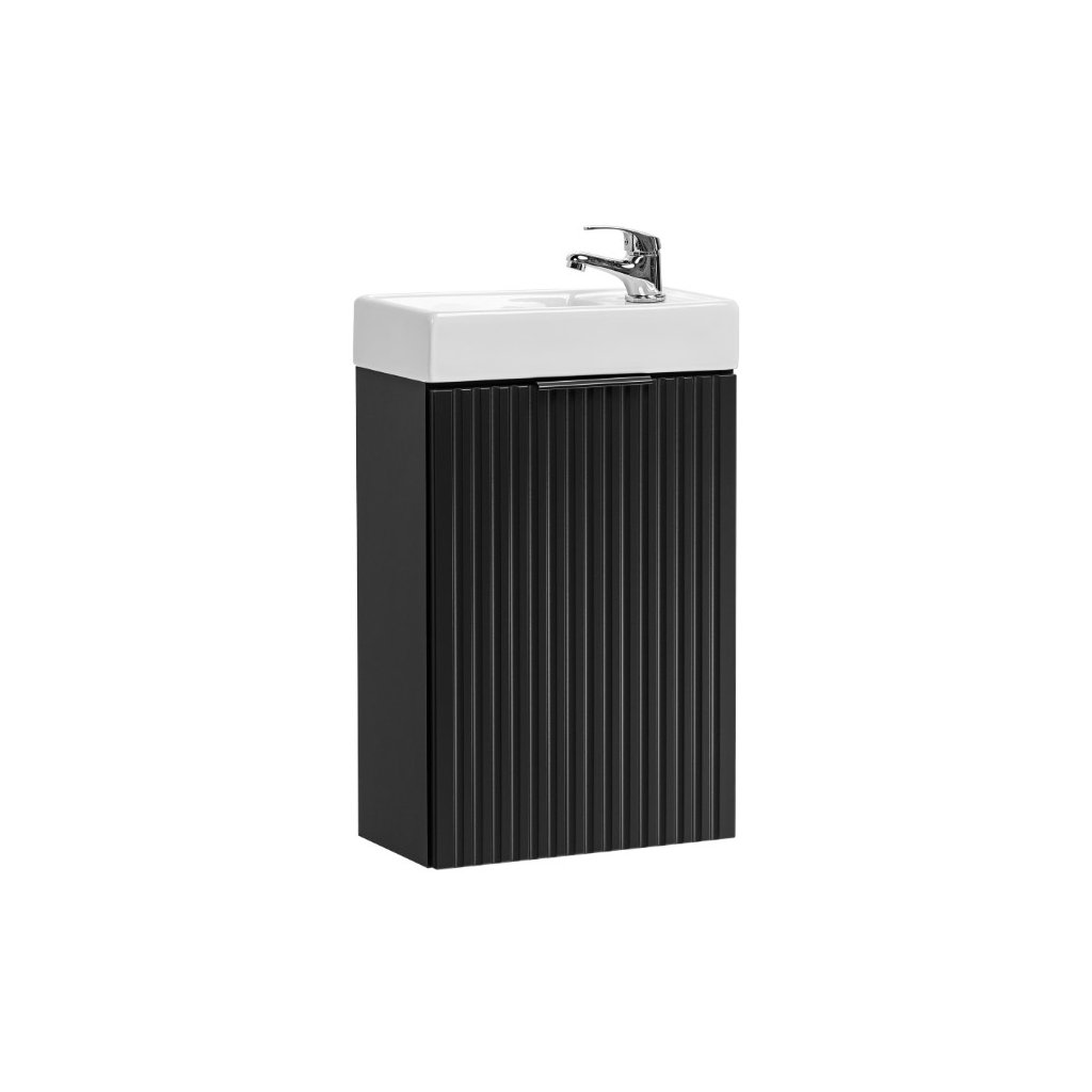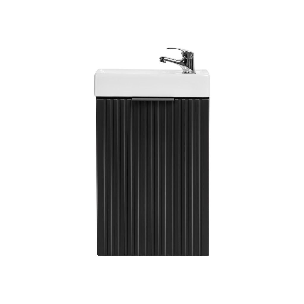 Mobilier de baie perfect cu lavoar ADEL Black U40/1 în negru Se potrivește perfect atât în băile moderne, cât și în cele clasice. Funcționalitatea sa ridicată va asigura confort chiar și pentru cei mai exigenți utilizatori. Designul minimalist este însuflețit de fronturile cu caneluri verticale, care sunt moderne și la mare căutare. Avantajul acestei colecții este posibilitatea de a alege culoarea mânerelor, prețul fiecărui dulap include trei versiuni de culoare ale mânerelor - auriu lucios, crom lucios și negru mat. Doar sifonul Preloc poate fi montat pe dulapul de sub chiuvetă, celelalte nu sunt compatibile cu dulapul.