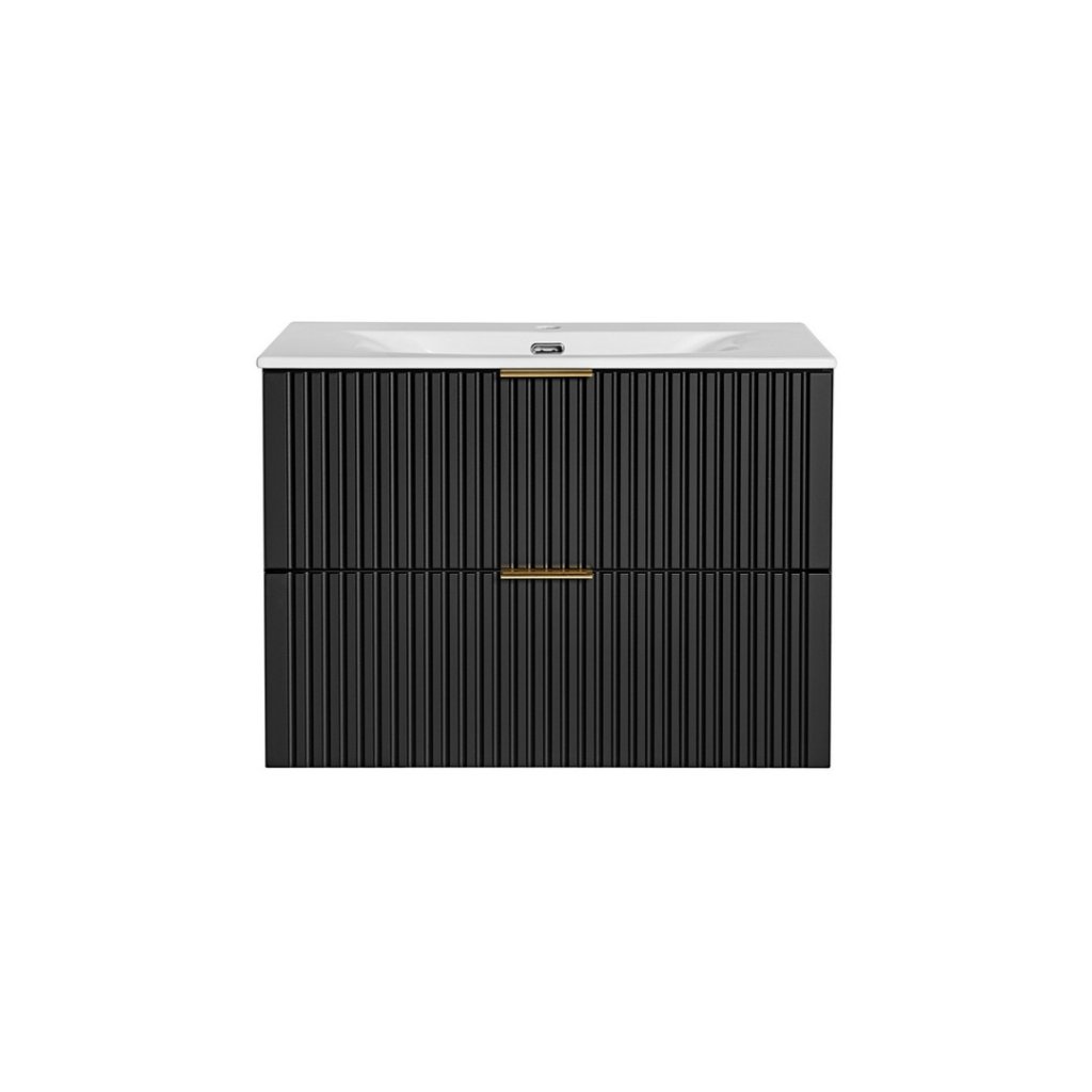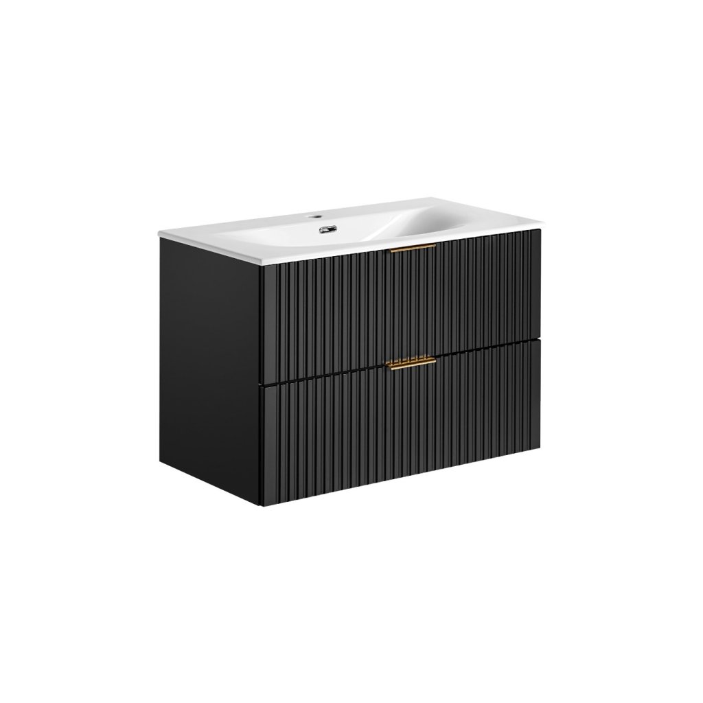 Mobilierul de baie perfect cu lavoar ADEL Black U80/1 în culoarea neagră este ideal atât pentru băile moderne, cât și pentru cele clasice, iar funcționalitatea sa ridicată va asigura confort chiar și pentru cei mai exigenți utilizatori. Designul minimalist este însuflețit de fronturile cu caneluri verticale , care sunt moderne și la mare căutare. Avantajul acestei colecții este și posibilitatea de a alege culoarea mânerelor, deoarece fiecare mobilier este furnizat cu mânere în trei culori : auriu lucios, crom lucios și negru mat. Datorită acestui fapt, este posibilă coordonarea culorilor mânerelor cu accesoriile , oglinzile în diferite culori ale ramei sau reîmprospătarea aspectului mobilierului în viitor. Pe mobilierul pentru lavoar se poate monta doar sifonul Preloc , celelalte nu sunt compatibile cu mobilierul.