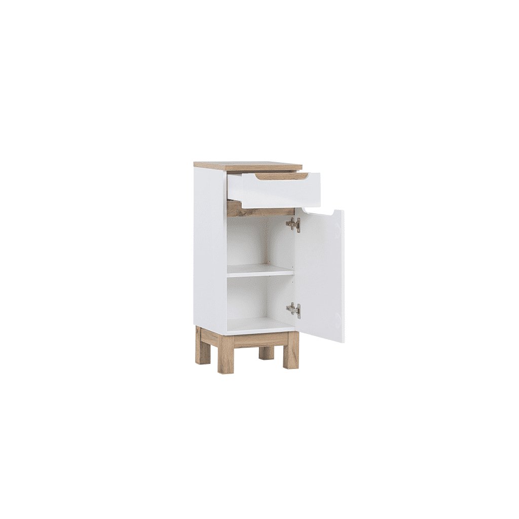 Designul modern combinat cu materiale de înaltă calitate creează o impresie de puritate și eleganță , acestea sunt dulapurile de baie BALI White. Dulapul de baie BALI White 810, cu lățimea de 35 cm, este potrivit pentru băi sau toalete mai mici. Dulapul are o ușă și un sertar. Luciul alb combinat cu decorul cald din lemn arată luxos. Datorită picioarelor înalte, puteți păstra cu ușurință podeaua curată.