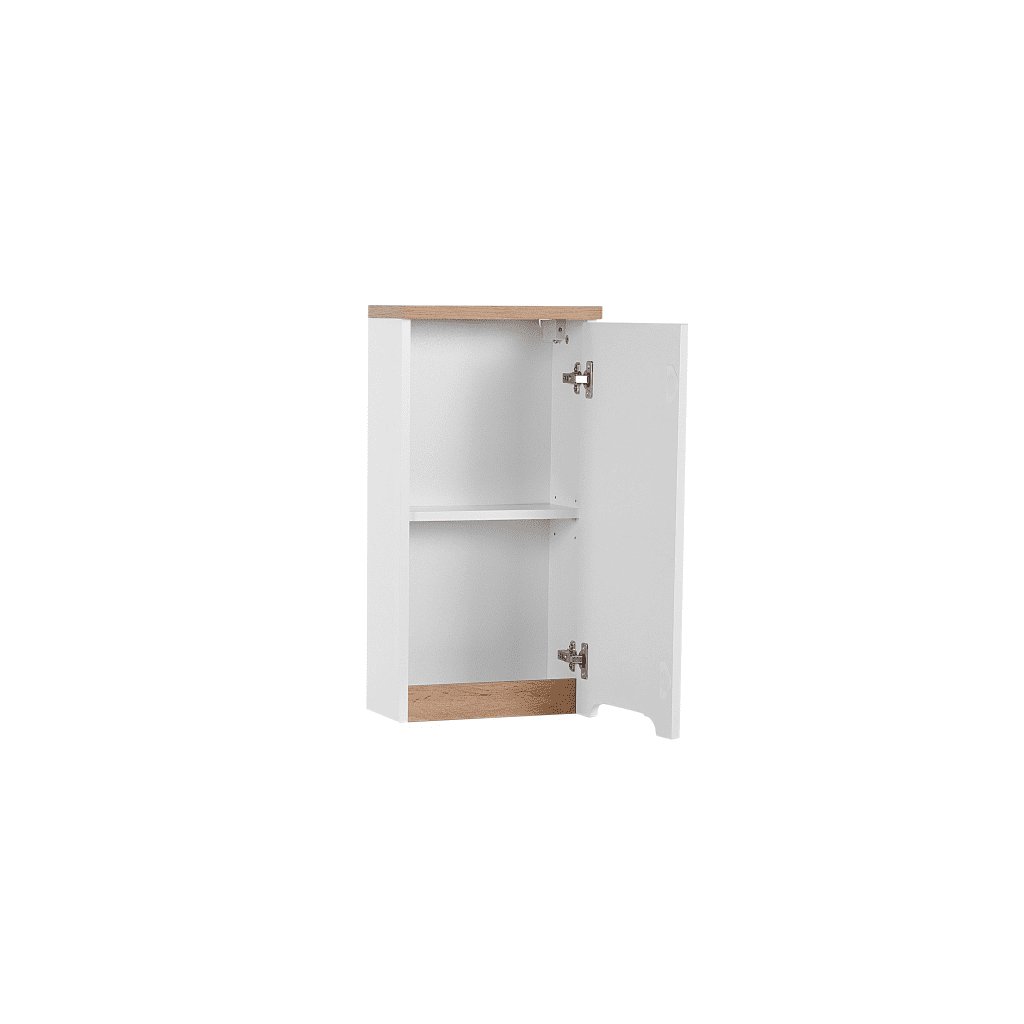 Designul modern combinat cu materiale de calitate creează o impresie de puritate și eleganță , acestea sunt dulapurile de baie BALI White. Dulapul de baie BALI White, montat pe perete, are o ușă cu un raft în interior. Luciul alb combinat cu decorul cald din lemn arată luxos. Datorită picioarelor înalte, puteți păstra cu ușurință podeaua curată.