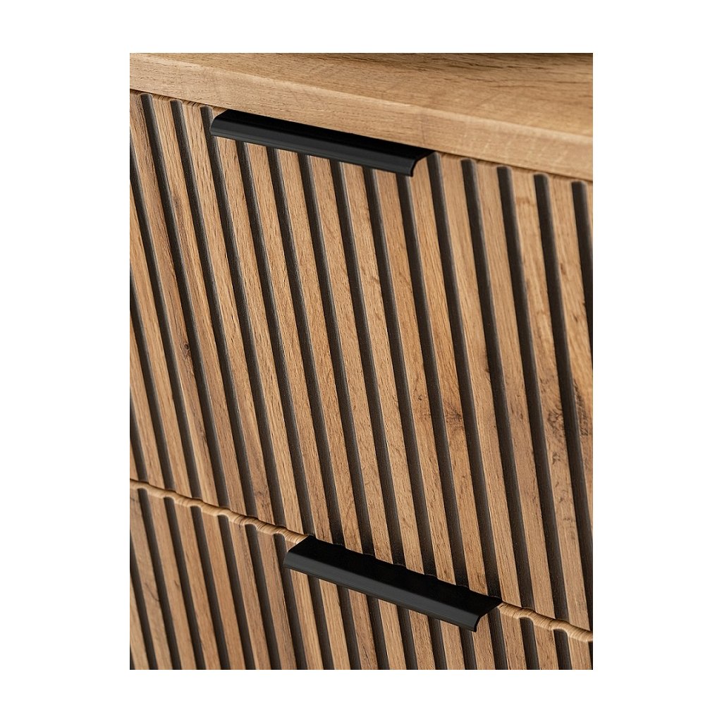 Mobilierul de baie XILO, cu modelul său distinctiv din stejar Wotan și canelurile închise la culoare, conferă băii un farmec natural aparte și o senzație de căldură. Contrastul dintre canelurile închise la culoare și modelul din stejar creează un efect vizual elegant și, în același timp, adaugă o notă de fler industrial băii. Mobilierul de lavoar XILO 82-100 are două sertare spațioase. Sertarele se deschid silențios, ca de obicei. Mobilierul de baie este completat perfect de blatul de lavoar ADEL din stejar, disponibil în diferite dimensiuni. Recomandăm instalarea sifonului Preloc pentru mobilierul de lavoar cu lavoar încastrat.
