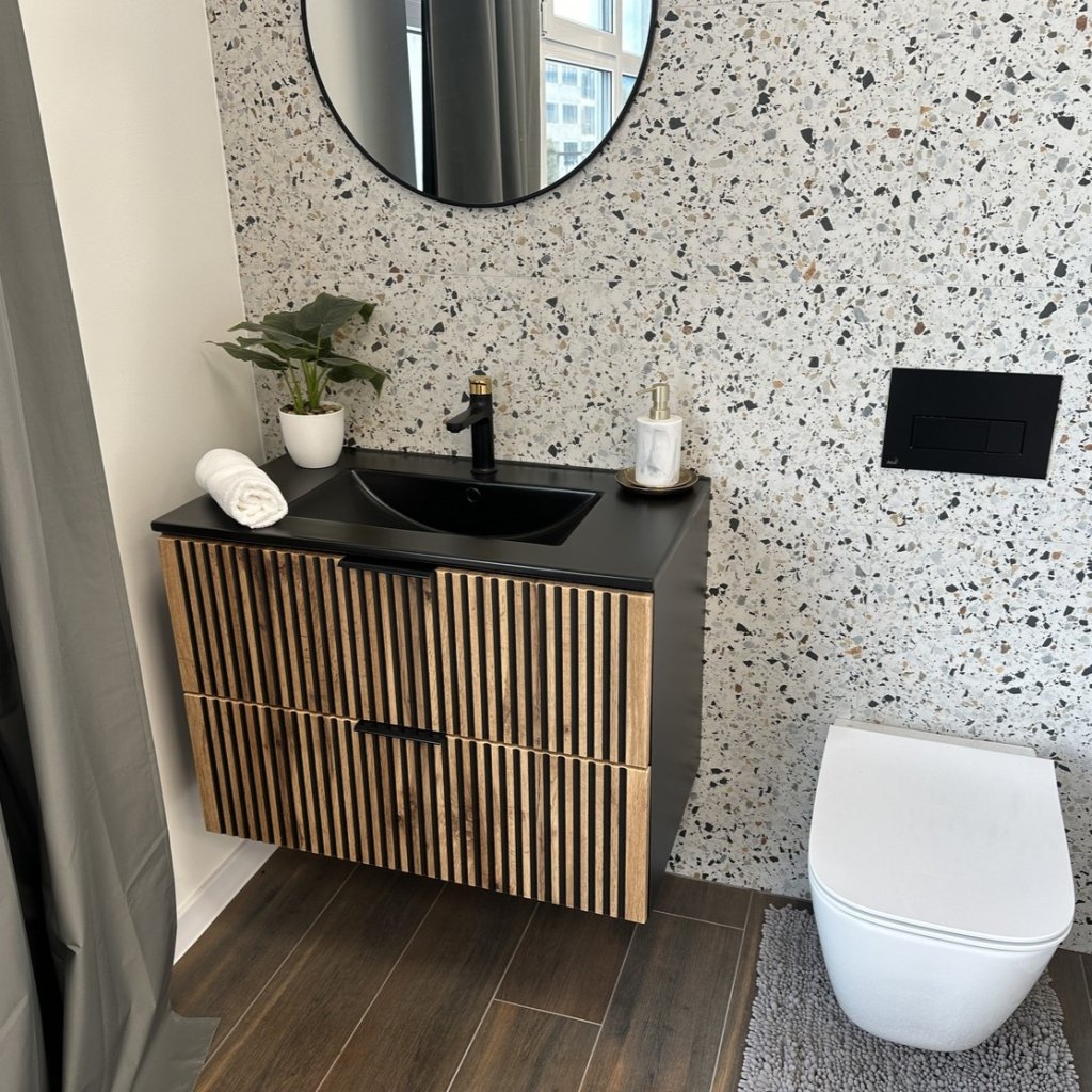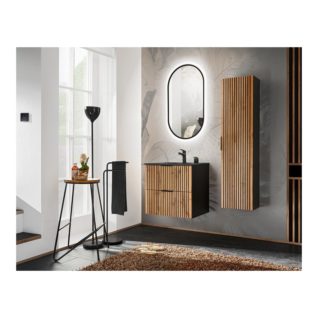 Mobilierul de baie XILO, cu modelul său distinctiv din stejar Wotan și canelurile închise la culoare, conferă băii un farmec natural aparte și o senzație de căldură. Contrastul dintre canelurile închise la culoare și modelul din stejar creează un efect vizual elegant și, în același timp, adaugă o notă de fler industrial băii. Mobilierul de lavoar XILO 82-60 are două sertare spațioase. Sertarele se deschid silențios, ca de obicei. Mobilierul de baie este completat perfect de blatul de lavoar ADEL din stejar, disponibil în diferite dimensiuni. Recomandăm instalarea sifonului Preloc pentru mobilierul de lavoar cu lavoar încastrat.