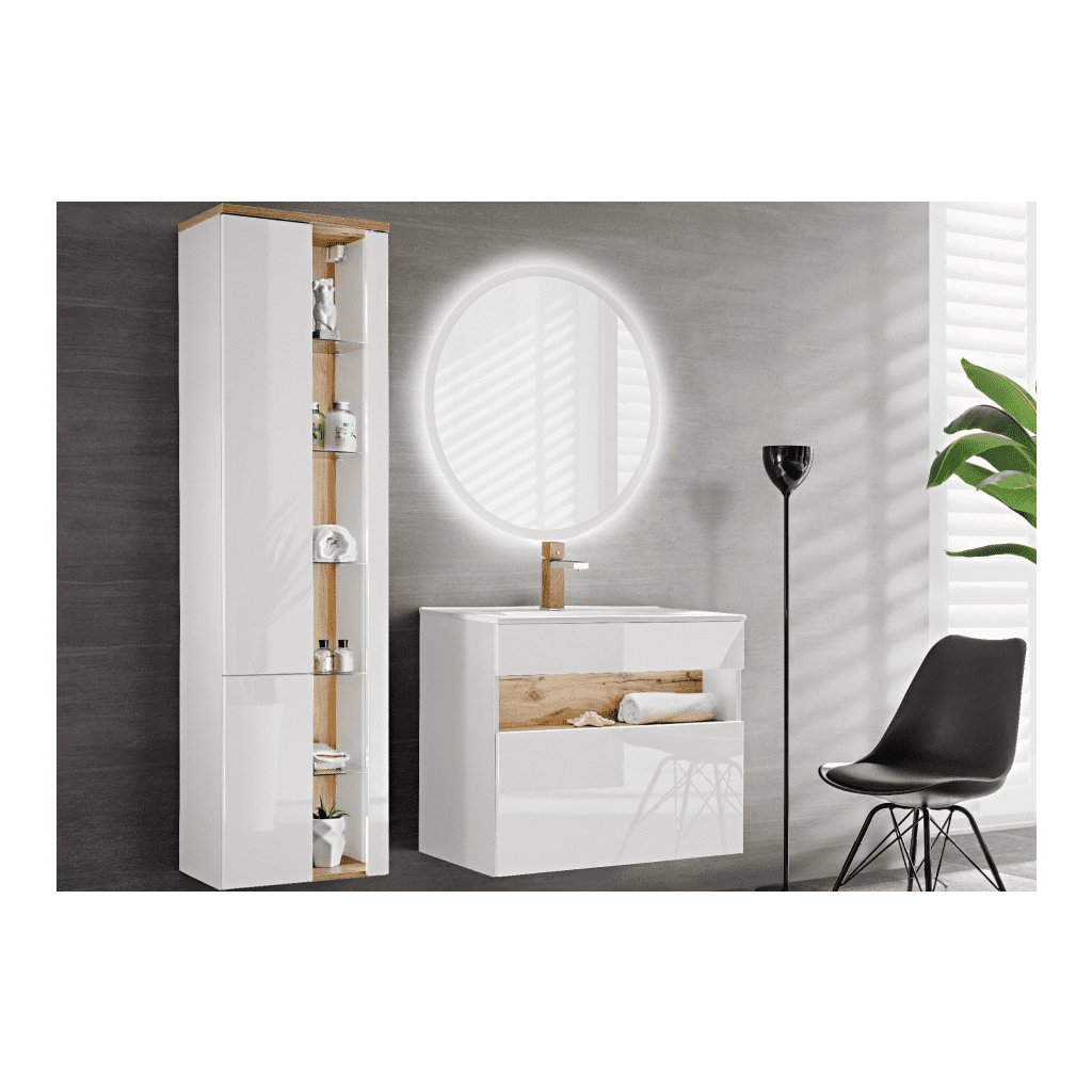 Dulapurile de baie BAHAM WHITE, în alb lucios, vor atrage atenția datorită finisajului lor lucios și moale, care reflectă lumina și conferă încăperii prospețime . Contrastul interesant dintre alb lucios și stejarul natural Wotan creează armonia perfectă a designului modern . Dulapurile de baie BAHAMA White de 60 cm, practice și spațioase, pentru lavoar, au un sertar cu închidere silențioasă. Oferă băii tale nota de lux pe care o merită.