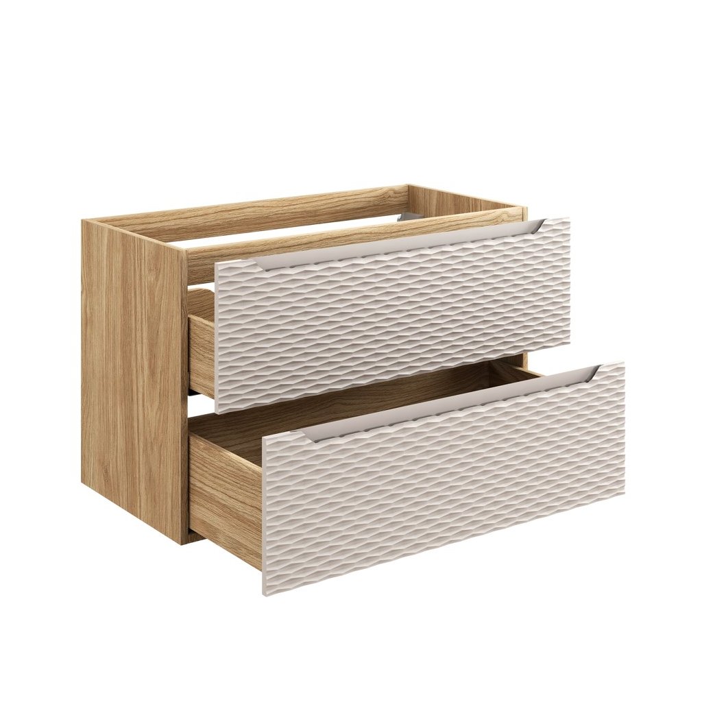 Mobilierul de lavoar OCEAN Beige 82-90-2S cu două sertare este echipat cu mecanisme de închidere silențioasă. Recomandăm instalarea unui sifon Preloc pentru mobilierul de lavoar cu lavoar încastrat.