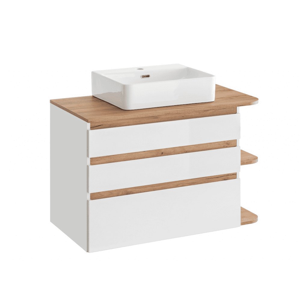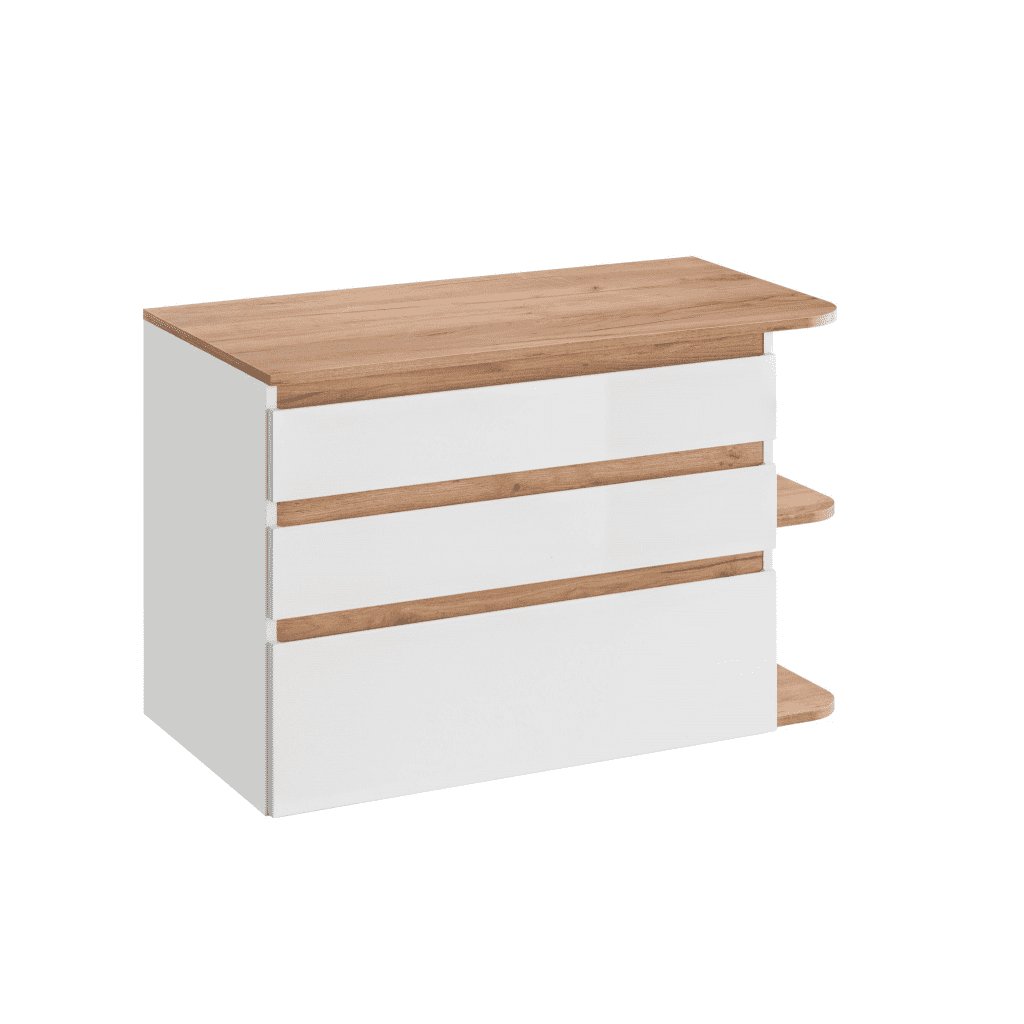 Mobilierul de baie PLATINUM alb lucios, într-o combinație subtilă cu stejar auriu artizanal, atrage imediat atenția prin puritatea și eleganța sa . Albul lucios creează impresia unui mediu mai spațios și mai luminos, evidențiind fiecare detaliu al băii. Mobilierul de baie PLATINUM 820 pentru lavoar are trei sertare practice cu închidere silențioasă și rafturi deschise. Transformă-ți baia într-un loc de relaxare și bunăstare, cu o notă de lux pe care o merită.