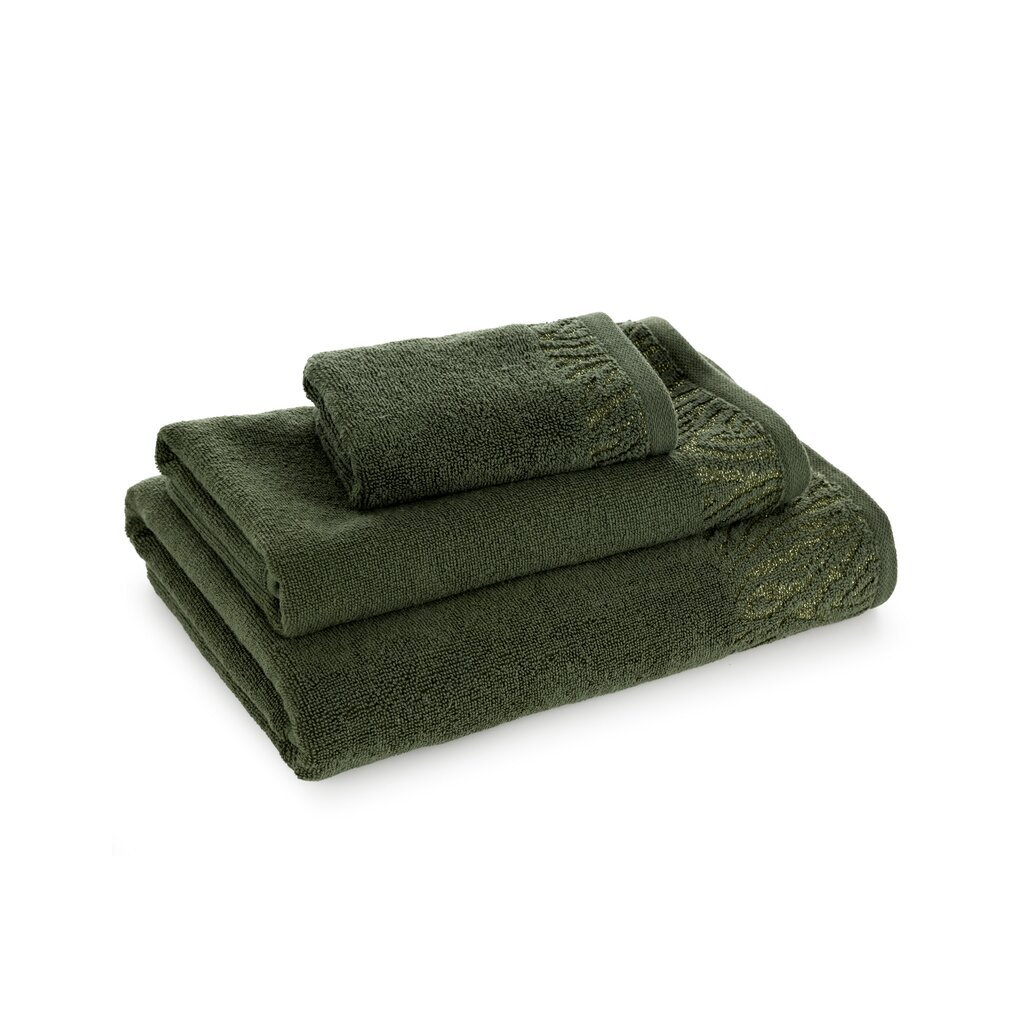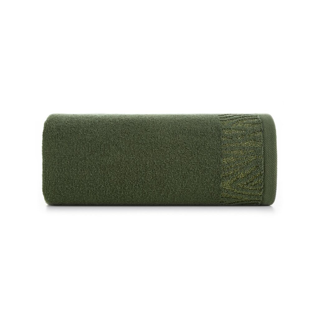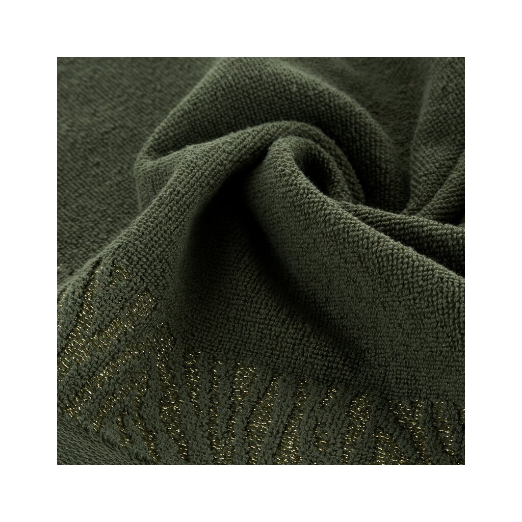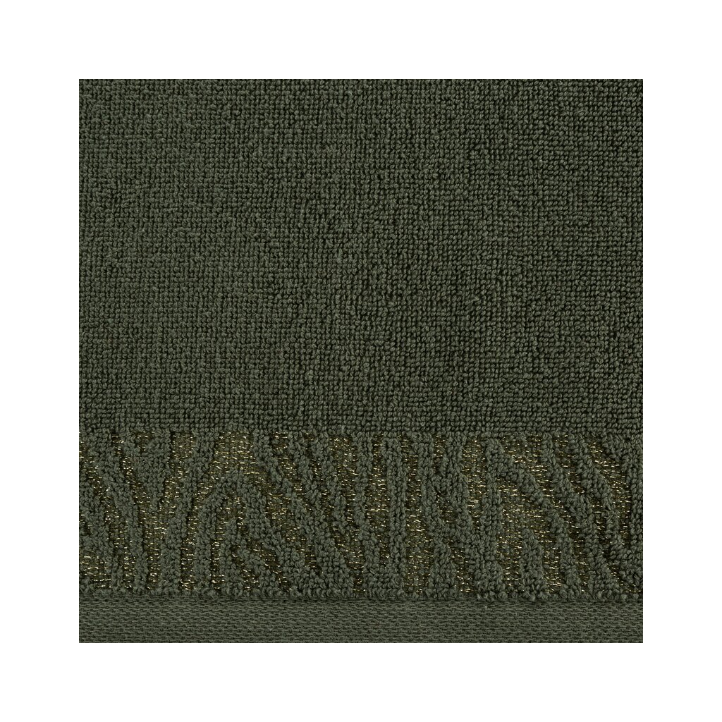 Prosop de baie din bumbac cu margine decorativă împletită cu fire strălucitoare, lățime: 70 cm, lungime: 140 cm, culoare: măsliniu, greutate: 500 GSM, compoziție: Material: 100% bumbac, parte decorativă: Compoziție: 50% bumbac, 50% poliester