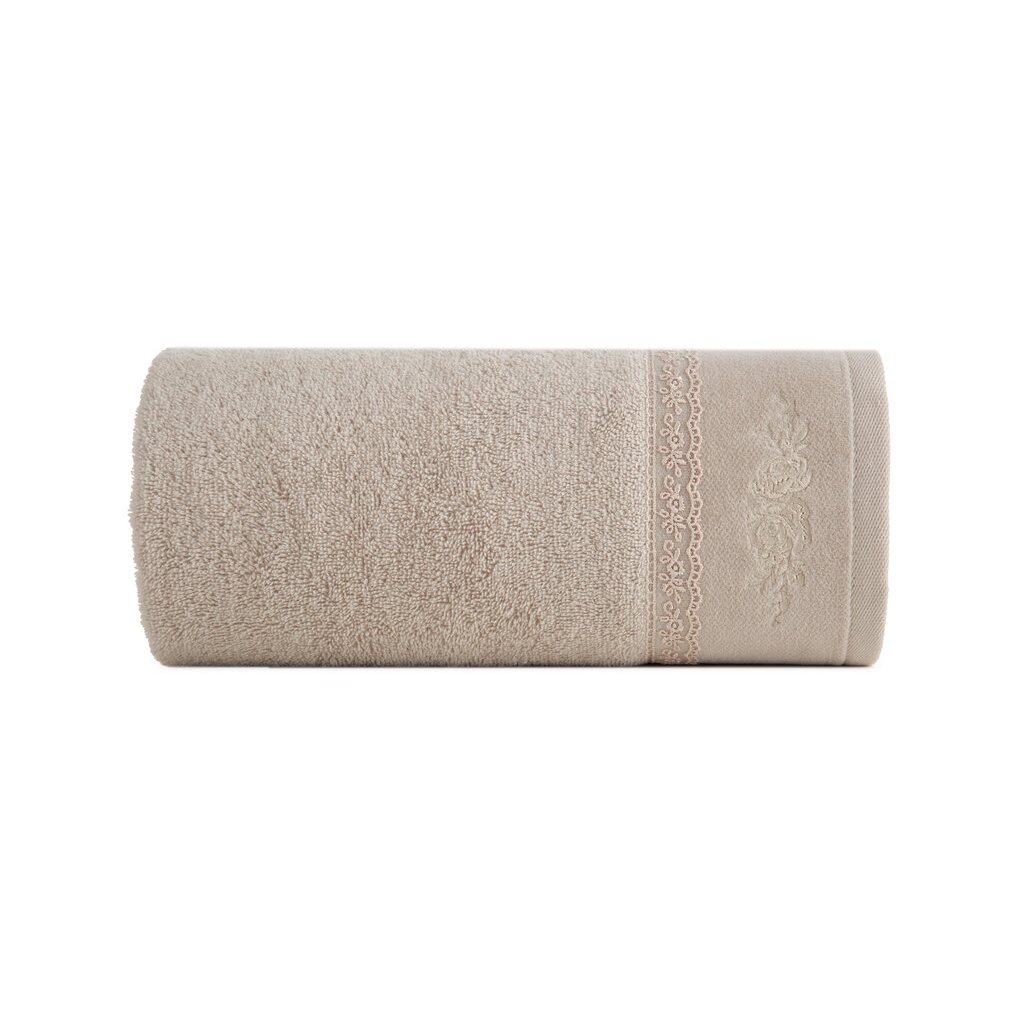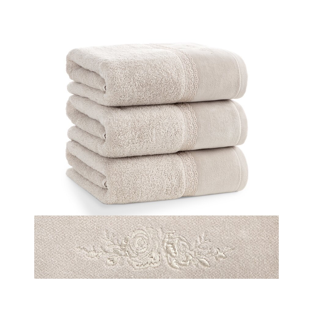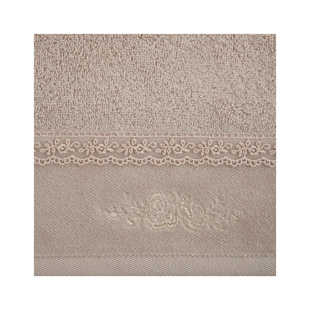 Prosop frumos confecționat din bumbac terry moale și absorbant, decorat cu o aplicație în formă de inimioare pline de trandafiri pe margini. Ideal pentru un cadou. Lățime: 30 cm, lungime: 50 cm, culoare: bej, greutate: 500 GSM, compoziție: Compoziție: 100% bumbac; parte decorativă: Compoziție: 100% poliester