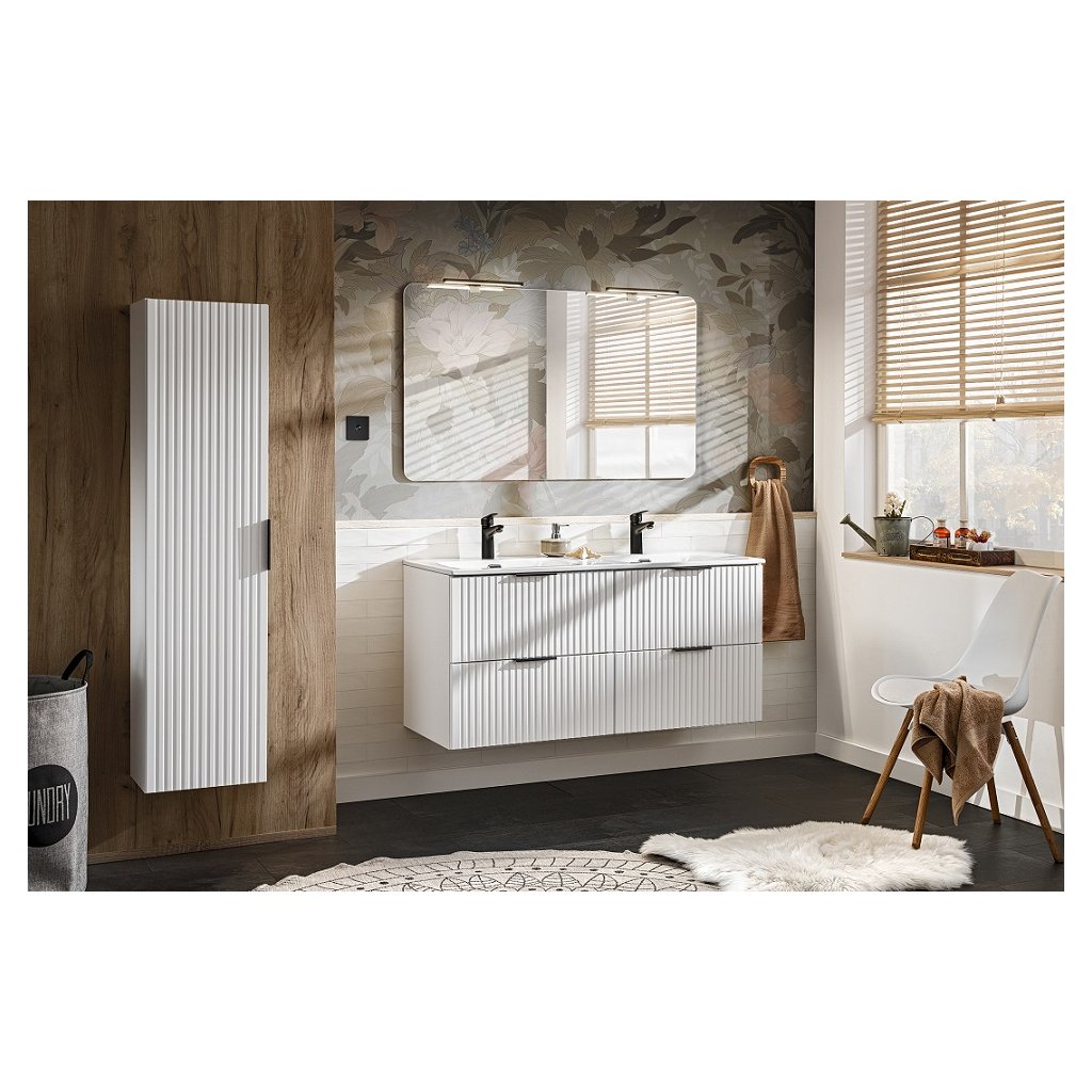 Setul perfect de baie ADEL 120/2, în culoarea albă, se va potrivi perfect atât în băile moderne, cât și în cele clasice. Funcționalitatea sa ridicată va asigura confort chiar și pentru cei mai exigenți utilizatori. Designul minimalist este însuflețit de fronturile cu caneluri verticale , care sunt moderne și la mare căutare. Avantajul acestei colecții este posibilitatea de a alege culoarea mânerelor, prețul fiecărui dulap include... Mânere în trei versiuni de culoare - auriu lucios, crom strălucitor și negru mat. Le puteți schimba în funcție de alte accesorii și totul se va potrivi perfect .
