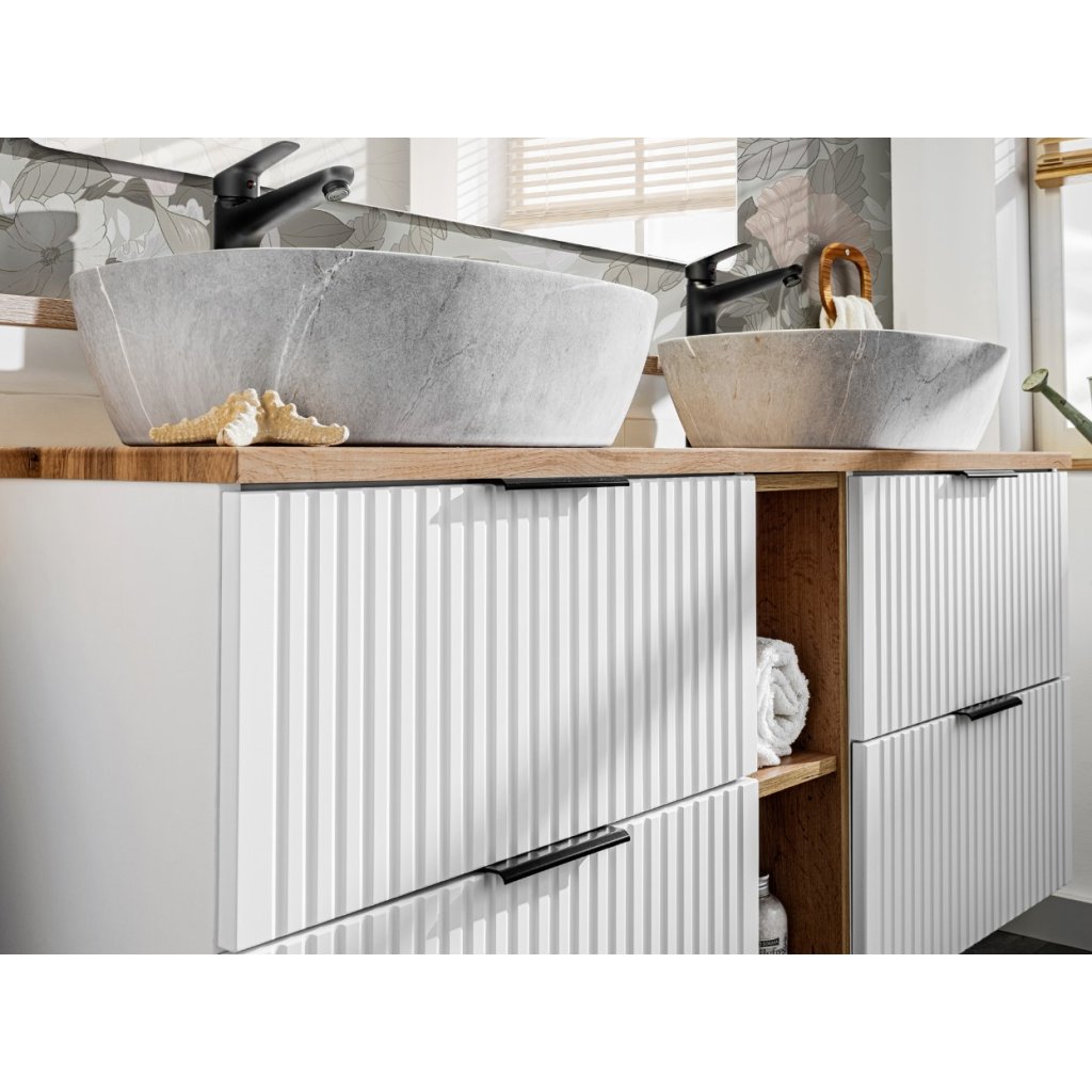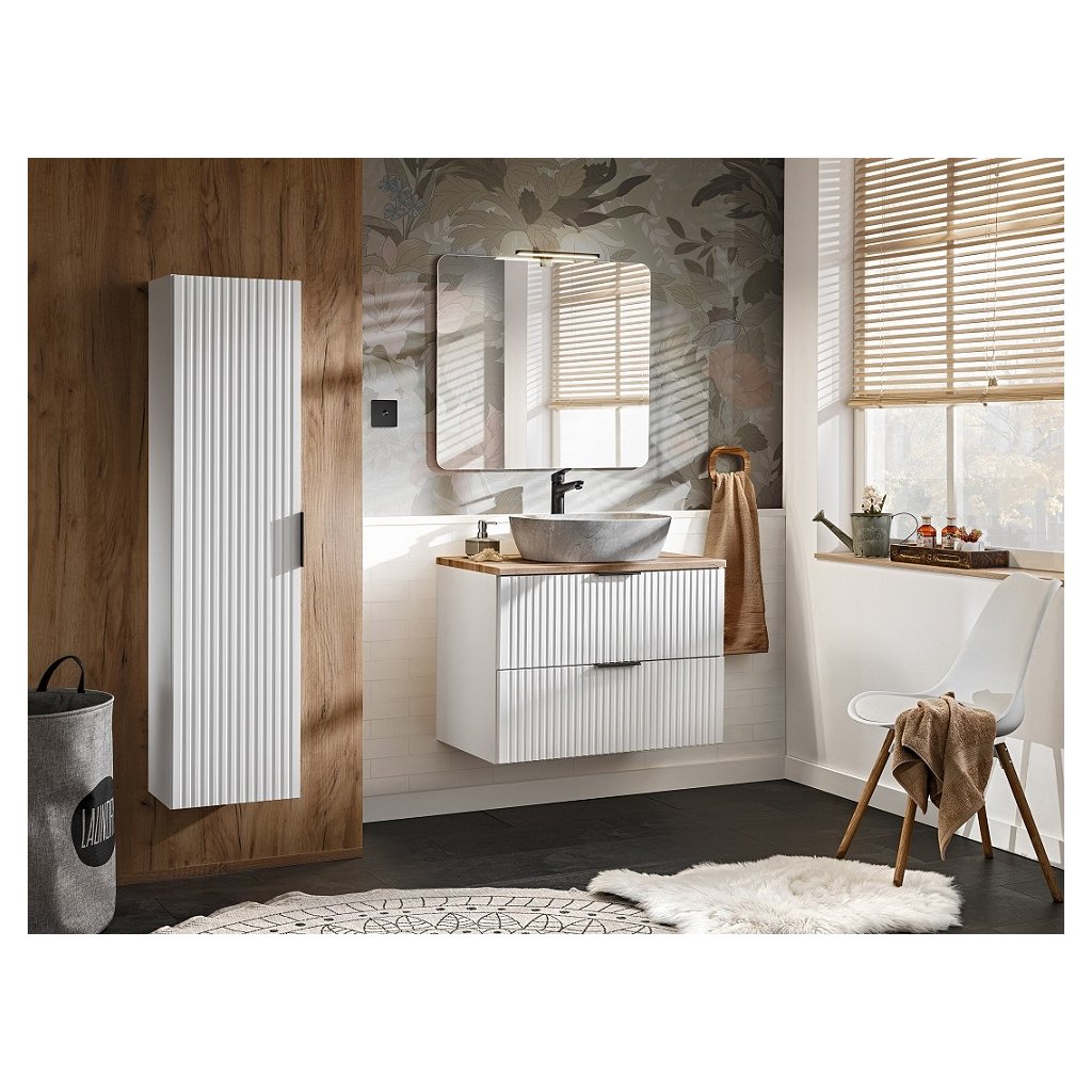 Setul perfect de baie ADEL 80/1, în culoarea albă, se va potrivi perfect atât în băile moderne, cât și în cele clasice. Funcționalitatea sa ridicată va asigura confort chiar și pentru cei mai exigenți utilizatori. Designul minimalist este însuflețit de fronturile cu caneluri verticale , care sunt moderne și la mare căutare. Avantajul acestei colecții este posibilitatea de a alege culoarea mânerelor, prețul fiecărui dulap include... Mânere în trei versiuni de culoare - auriu lucios, crom strălucitor și negru mat. Le puteți schimba în funcție de alte accesorii și totul se va potrivi perfect .