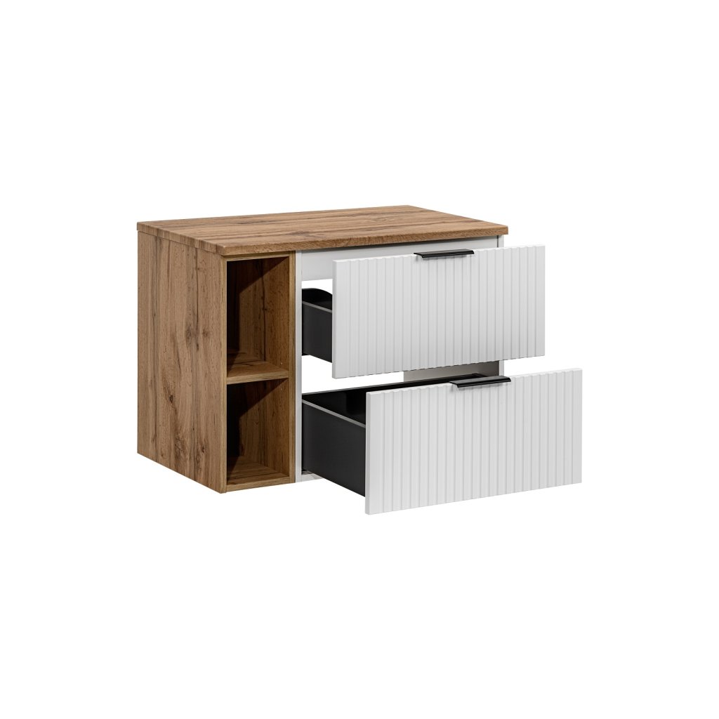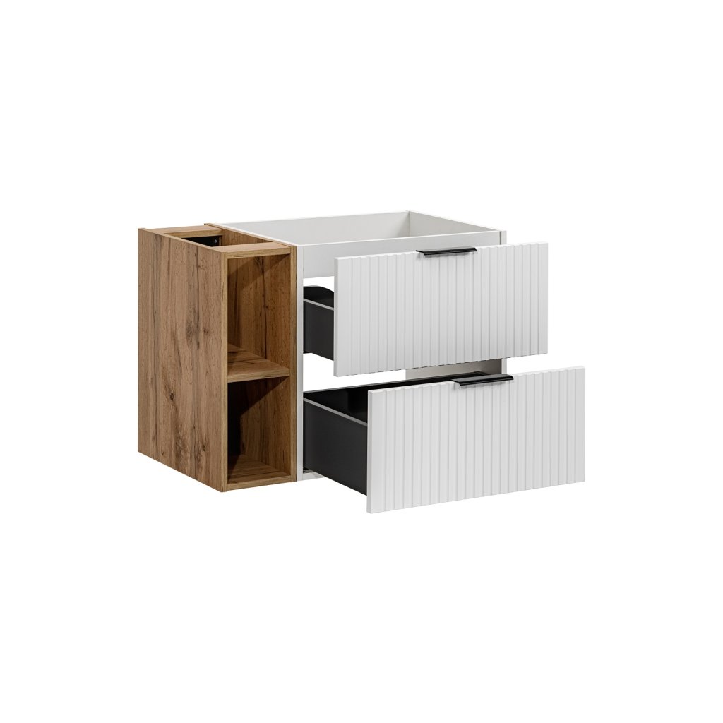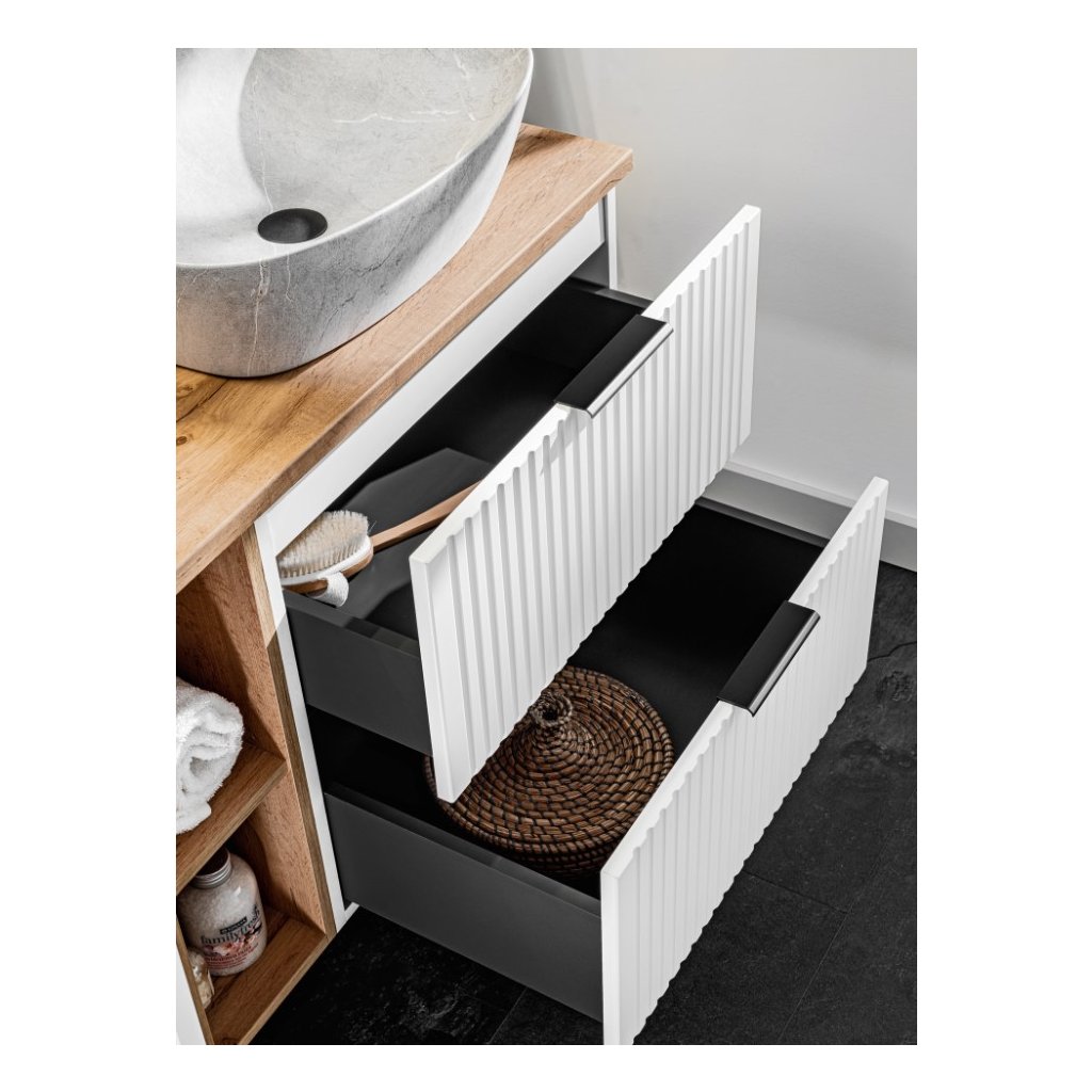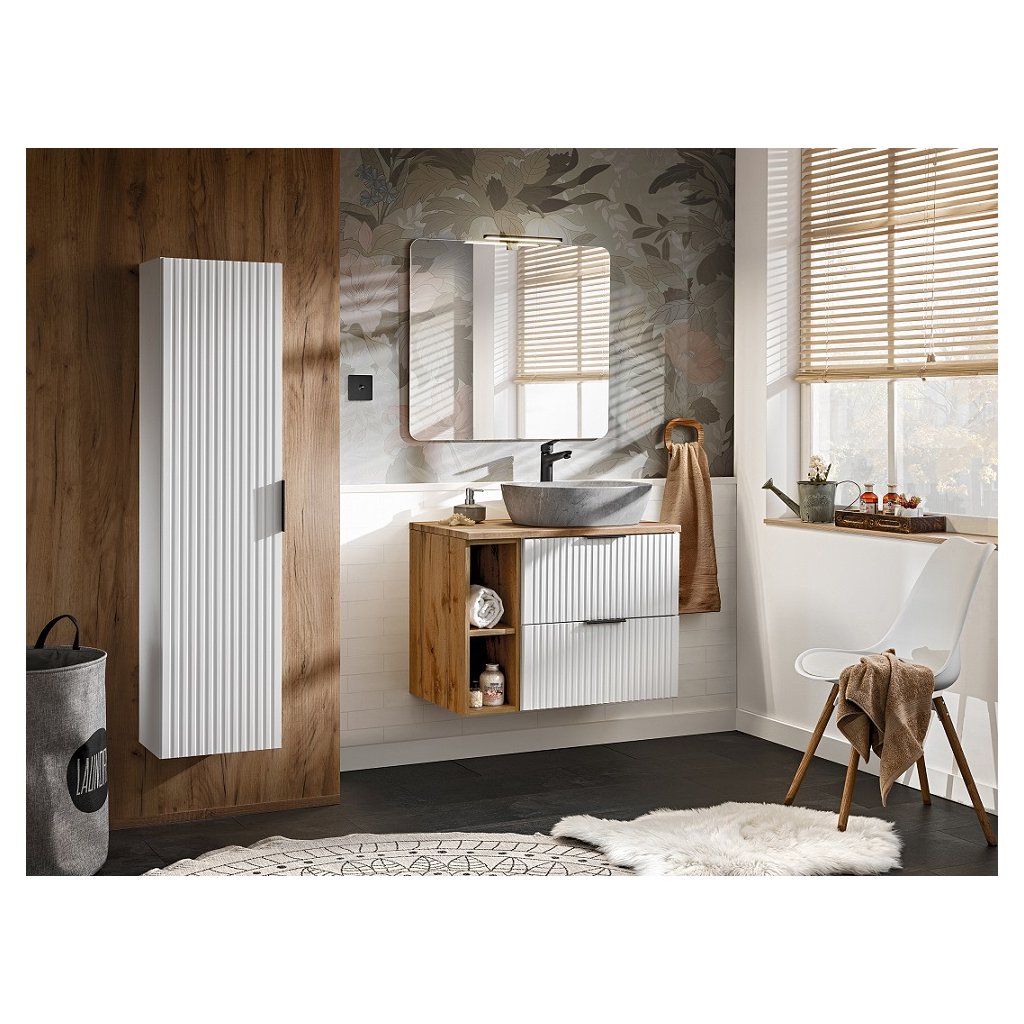 Setul perfect de baie ADEL 80/2, în culoarea albă, se va potrivi perfect atât în băile moderne, cât și în cele clasice. Funcționalitatea sa ridicată va asigura confort chiar și pentru cei mai exigenți utilizatori. Designul minimalist este însuflețit de fronturile cu caneluri verticale , care sunt moderne și la mare căutare. Avantajul acestei colecții este posibilitatea de a alege culoarea mânerelor, prețul fiecărui dulap include... Mânere în trei versiuni de culoare - auriu lucios, crom strălucitor și negru mat. Le puteți schimba în funcție de alte accesorii și totul se va potrivi perfect .