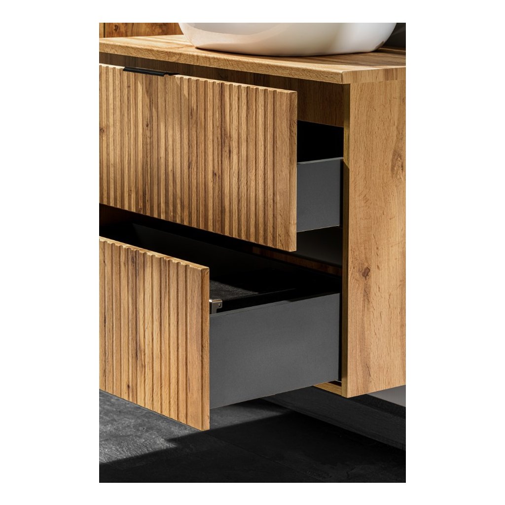 Setul perfect pentru baie ADEL Oak 80/1, cu decor din stejar, se va potrivi perfect atât în băile moderne, cât și în cele clasice. Designul minimalist este însuflețit de fronturile cu caneluri verticale , care sunt foarte moderne și la mare căutare. Prețul setului include trei versiuni de culoare ale mânerelor , pe care le puteți schimba în funcție de alte accesorii și totul se va potrivi perfect . Datorită materialelor de înaltă calitate și designului modern , vă va oferi bucurie pentru o lungă perioadă de timp.
