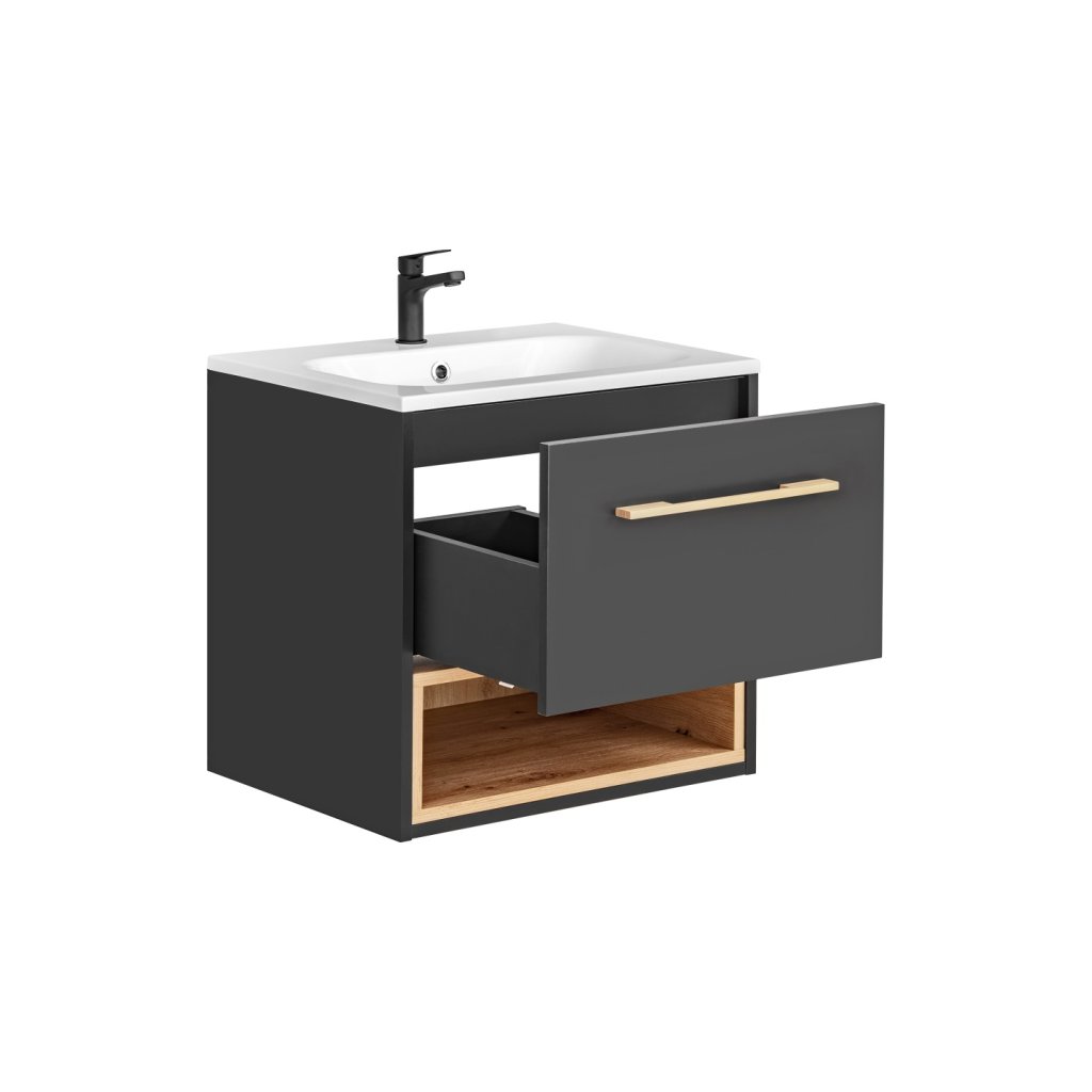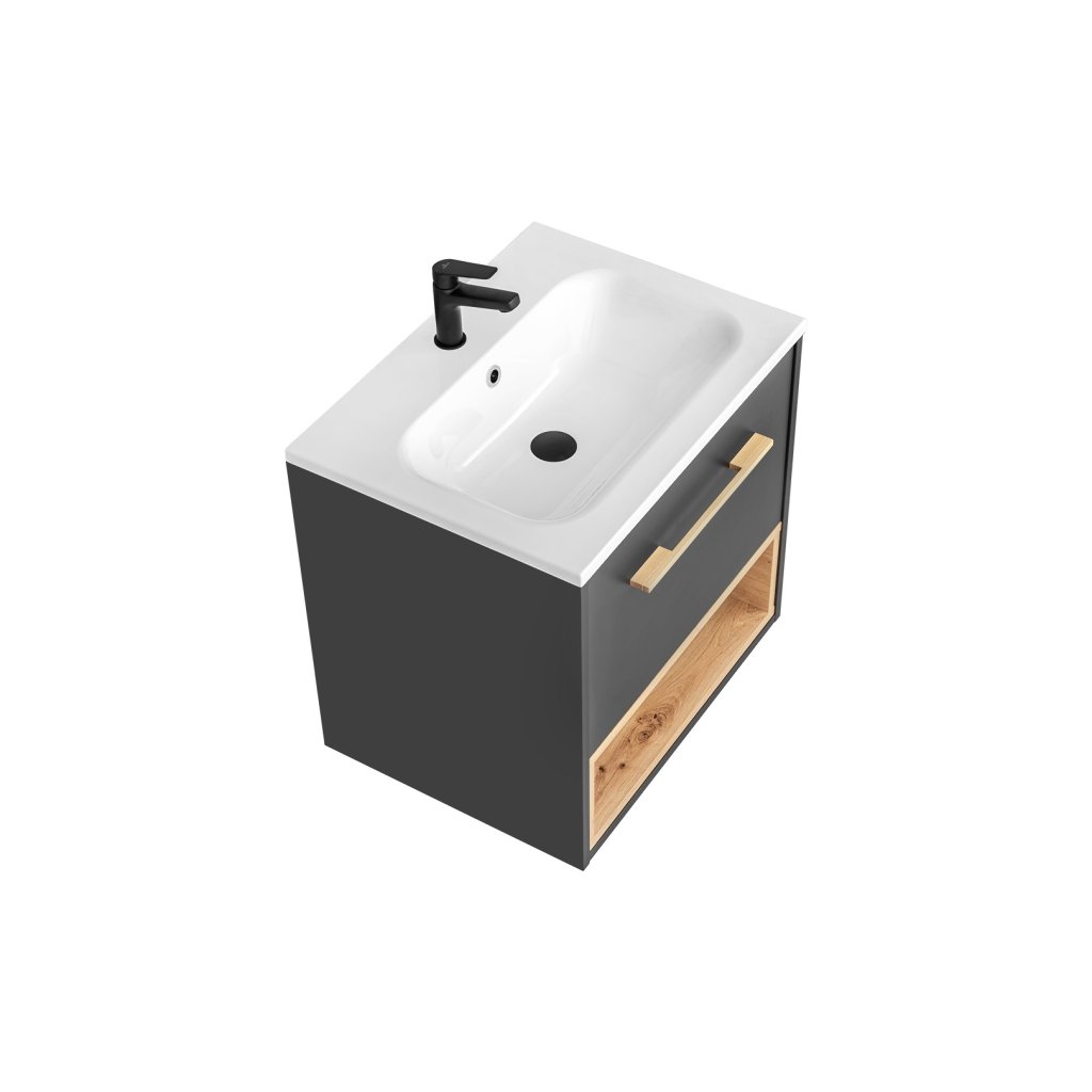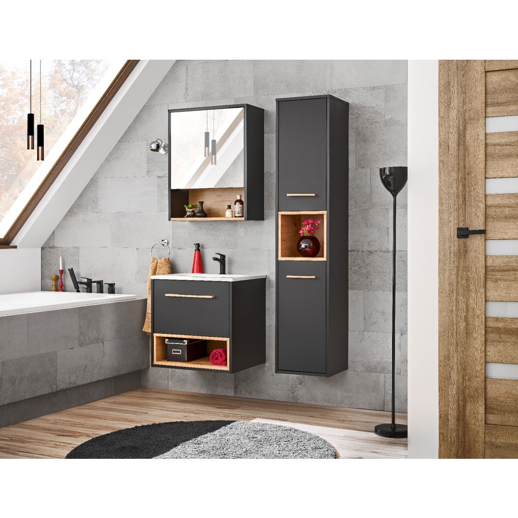 Setul de baie fermecător BORNEO COSMOS este o piesă originală pentru fiecare baie modernă . Combinația fermecătoare de decor din lemn în nuanța stejarului artizanal și a griului cosmos va crea o armonie perfectă de culori . Borneo este completat de mânere delicate în culoarea stejarului artizanal. Mobilierul se livrează demontat. Setul de baie BORNEO este format dintr-un dulap înalt, un dulap pentru lavoar, un dulap cu oglindă și un lavoar. Ușa poate fi montată în varianta stânga sau dreapta. Lavoarele nu sunt furnizate cu baterie și sifon, pe care le puteți achiziționa din oferta noastră de Accesorii.