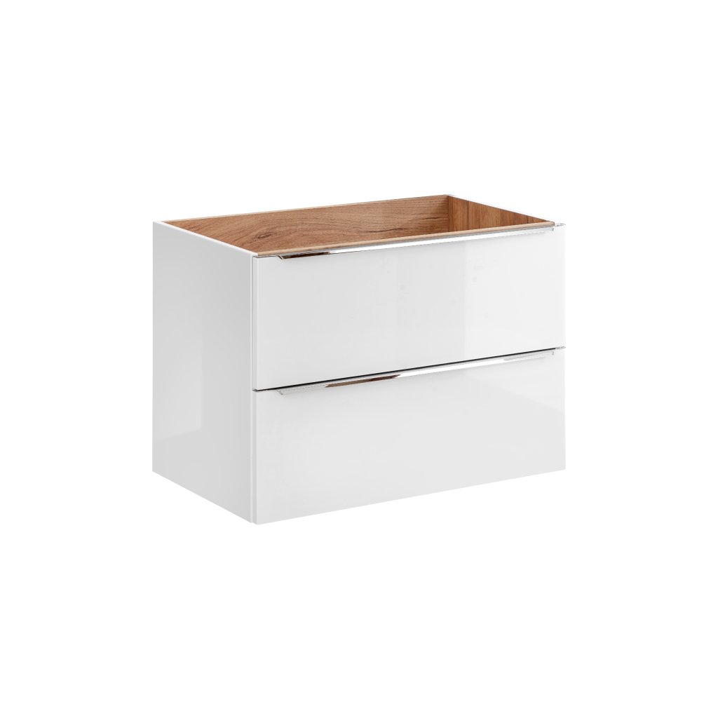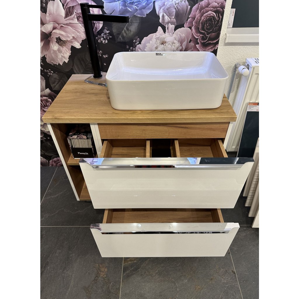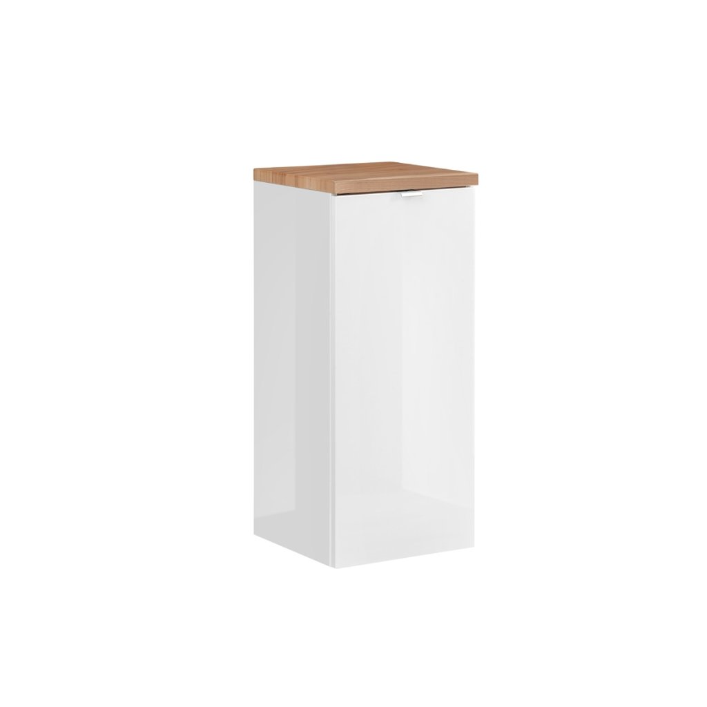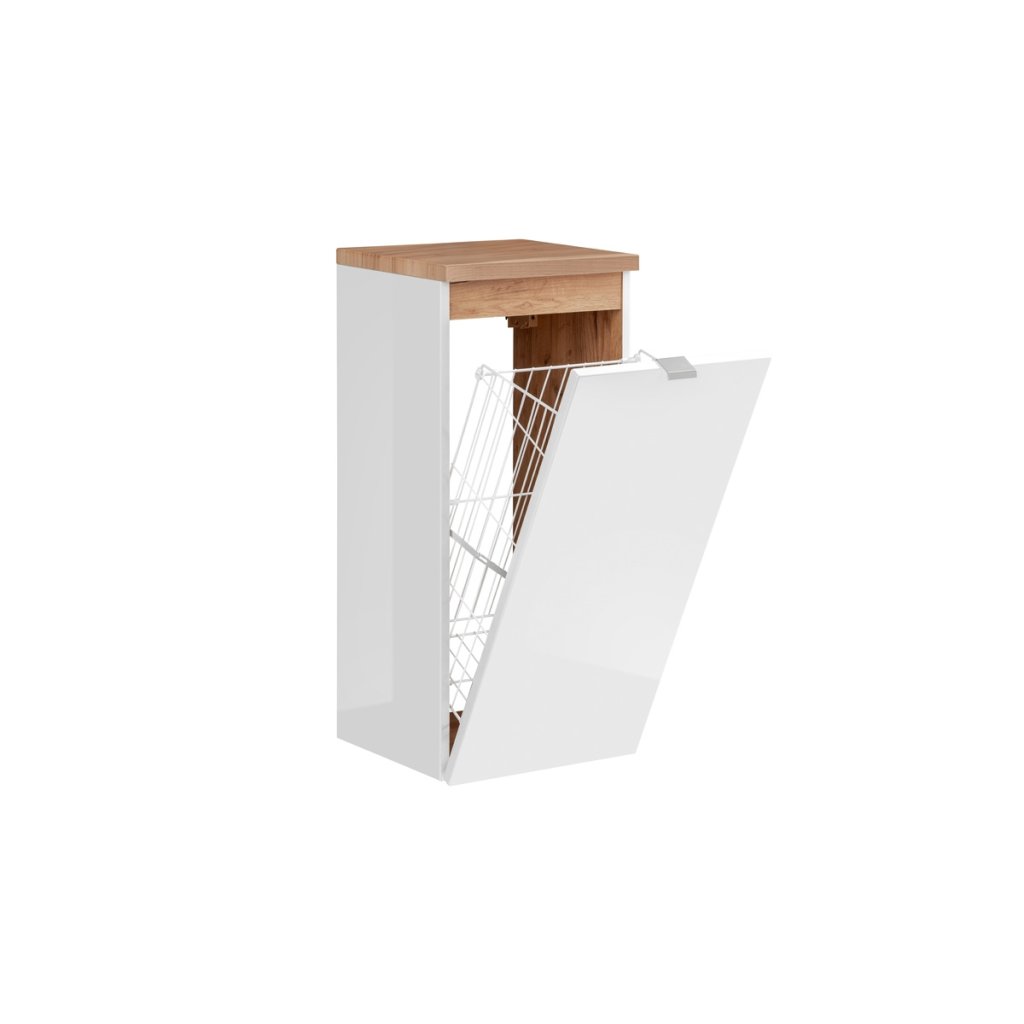 Setul de baie CAPRI White , realizat într-un design cromatic atemporal, cu un design simplu și elemente moderne. Designul de culoare alb lucios / stejar auriu artizanal, are linii curate și un aspect irezistibil. Este fabricat din placă laminată. Mânerele metalice sunt caracteristice, cu închidere silențioasă a ușilor și sertarelor. Nu mai visa doar la baia perfectă, ci creează-o datorită frumosului set de baie CAPRI White. Setul de baie CAPRI White 80/3 este format dintr-un dulap înalt, un dulap pentru lavoar, un lavoar, un dulap jos cu coș, un dulap cu oglindă și iluminare LED. Ușa poate fi montată în varianta stânga sau dreapta.