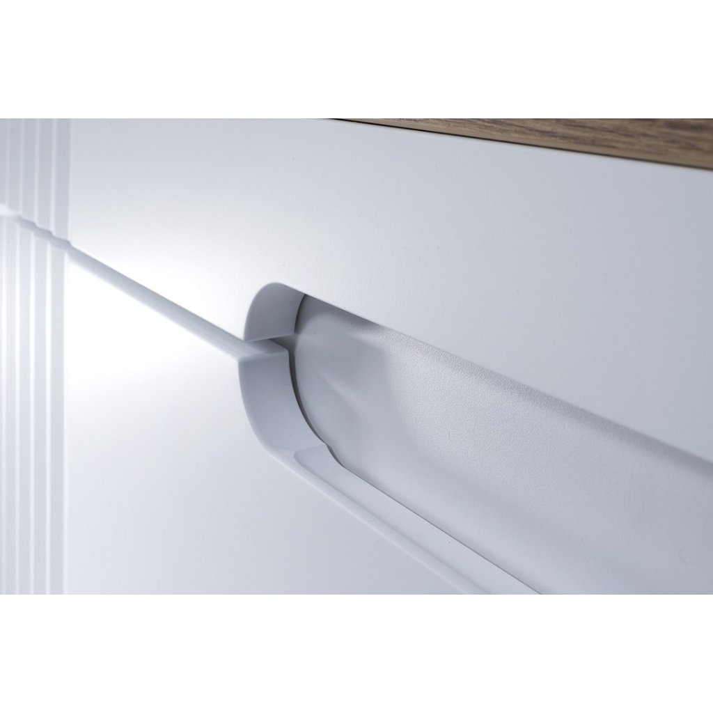 FIJI White este o colecție de baie care combină modernitatea cu stilul atemporal. Mobilierul din această colecție poate fi asamblat opțional ca piese suspendate sau verticale pe picioare din lemn. Setul de baie FIJI White 100/1 include un dulap înalt, un dulap pentru lavoar FIJI White în alb alpin și un blat de lavoar Oak Coast Evoke în stejar coastal Evoke, o oglindă Juliet, iluminat Juliet și un lavoar Lena White. Mânerele au fost înlocuite cu o deschidere practică frezată a dulapurilor , ale căror fronturi se disting prin caneluri verticale. Un set de baie simplu și totuși modern, care vă va ajuta să creați wellness-ul perfect acasă, adică FIJI White. Aranjați- vă baia conform dorințelor dumneavoastră.