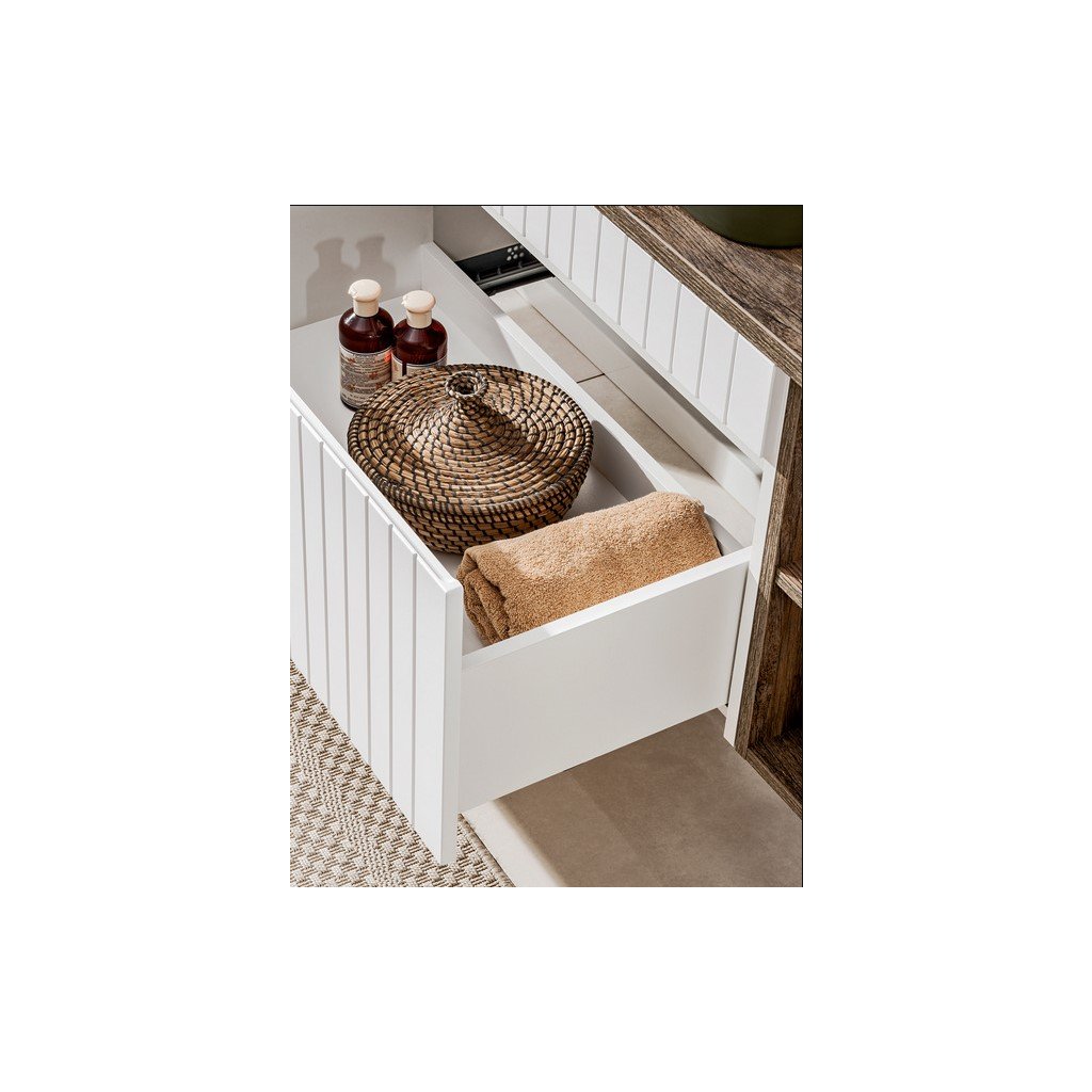 Ideile tale despre o baie modernă pot fi realizate mai ușor decât crezi. Mobilierul de baie cu un design simplu este însuflețit de caneluri verticale și se va potrivi în orice baie . Mobilierul alb combinat cu decorul din lemn de stejar Santa Fe este o combinație perfectă de culori care se potrivește în orice stil de interior al băii. Nu ezita și mobilează-ți baia cu setul de design ICONIC White. Puteți găsi oglinzi și corpuri de iluminat în categoria accesorii.