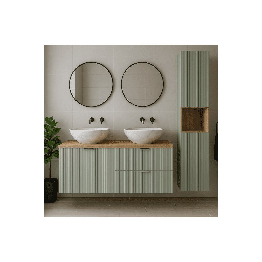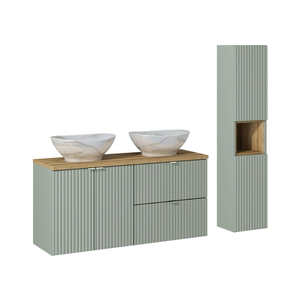 Setul de baie LINE REED GREEN 120/2 va aduce esența individualității în baia dumneavoastră, combinând luxul și armonia. Culoarea sa salvie nu numai că va atrage atenția, dar va oferi și interiorului un caracter unic și îndrăzneț. Canelurile verticale de pe fronturile mobilei adaugă o eleganță subtilă și subliniază unicitatea întregii colecții. Mânerele cromate adăugate completează aspectul modern și contribuie la estetica perfectă. Setul de baie LINE Reed Green 120/2 include: un dulap pentru lavoar cu sertare, un dulap cu uși, un blat, un dulap înalt, un raft cubic și un lavoar ceramic PATI. Bateriile și oglinzile nu sunt incluse în prețul setului, acestea putând fi comandate separat.