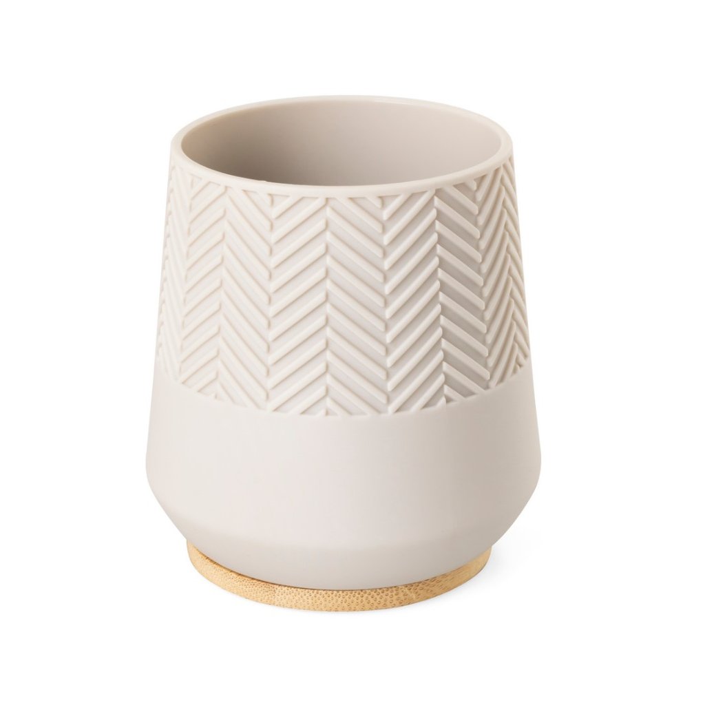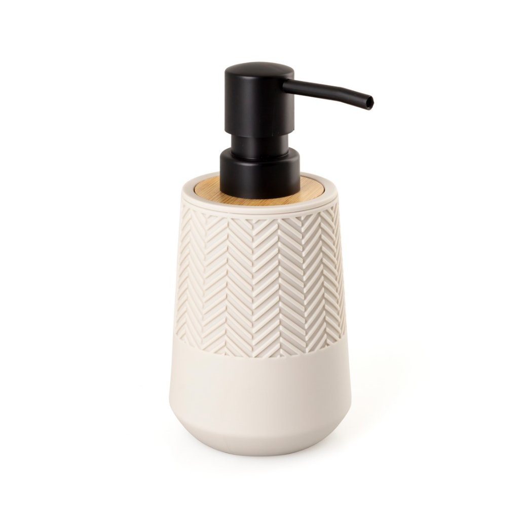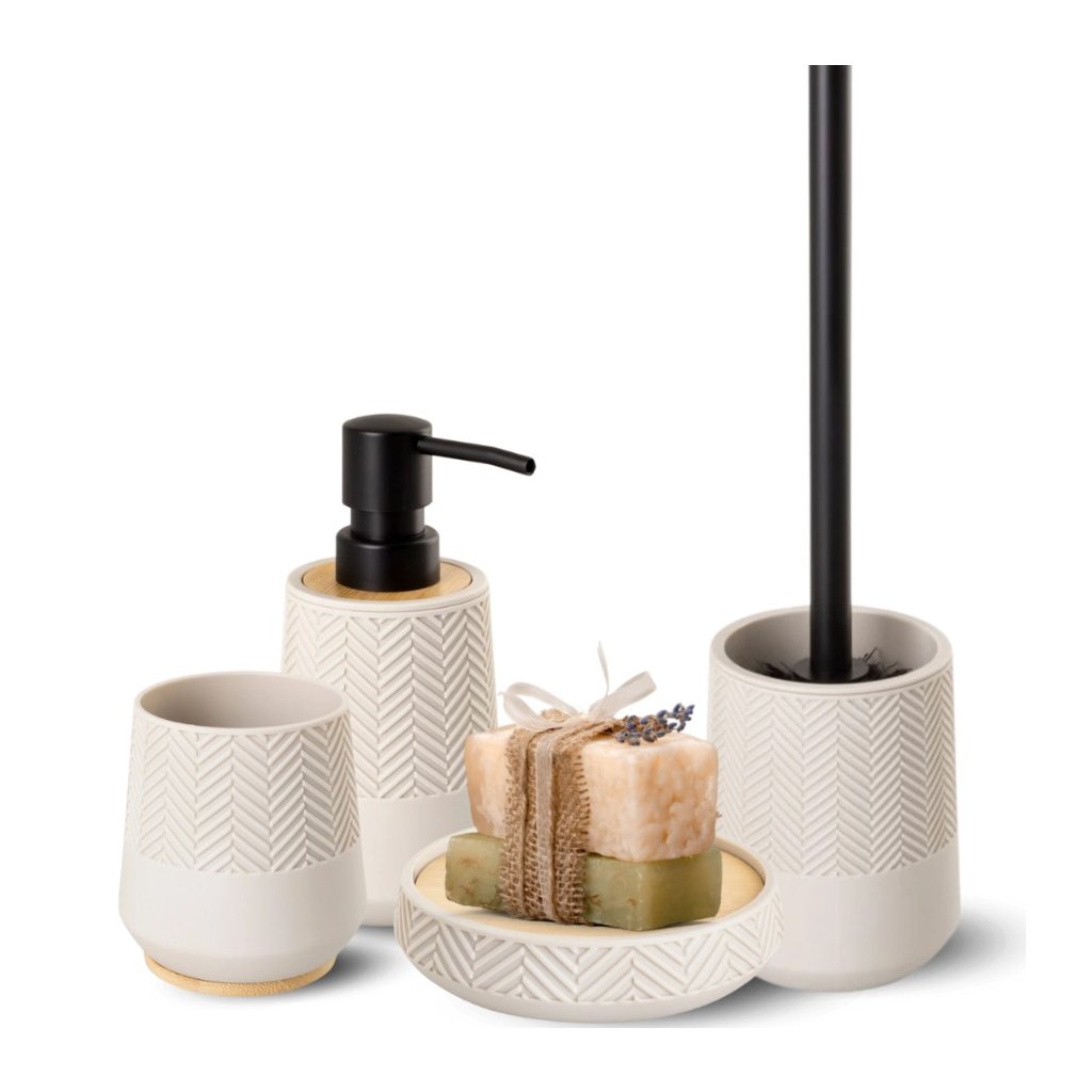 Setul practic de baie HERMOSA, în nuanță bej, este un plus elegant și modern pentru orice baie. Elementul decorativ din bambus natural aduce căldură și confort spațiului. Pompa neagră de pe dozator creează un accent contrastant și completează aspectul armonios. Setul garantează o utilizare confortabilă și de lungă durată , ideal pentru cei care caută o combinație între estetică și funcționalitate.
