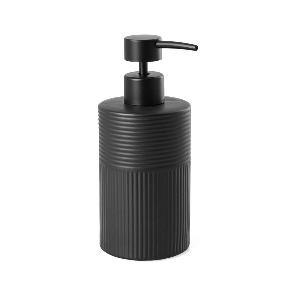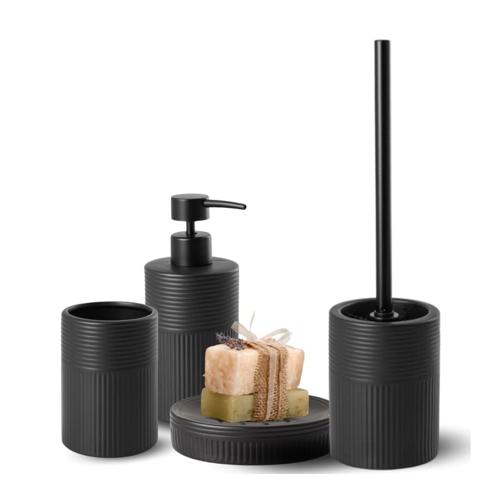 Setul de baie negru intens din seria Tusa este o completare elegantă și stilată pentru interioarele moderne. Șanțurile decorative conferă setului un caracter unic și subliniază designul său luxos . Setul se potrivește perfect în amenajări minimaliste și elegante de baie , unde creează un accent sofisticat în baie.